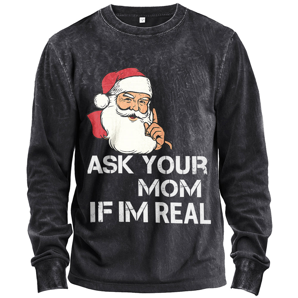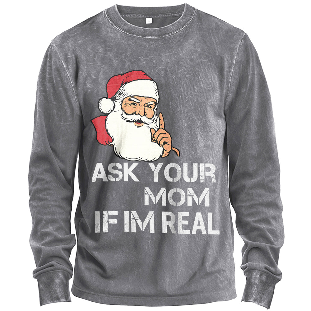 Regular price $29.99 USDPlayfully irreverent and built to last. This men’s long-sleeve T-shirt pairs a vintage-wash army-green body with a retro Santa graphic and bold “ASK YOUR MOM IF I’M REAL” lettering—perfect for holiday hangs and everyday wear.