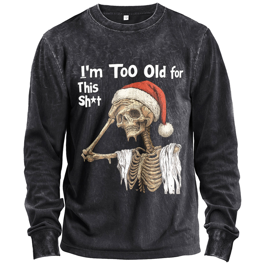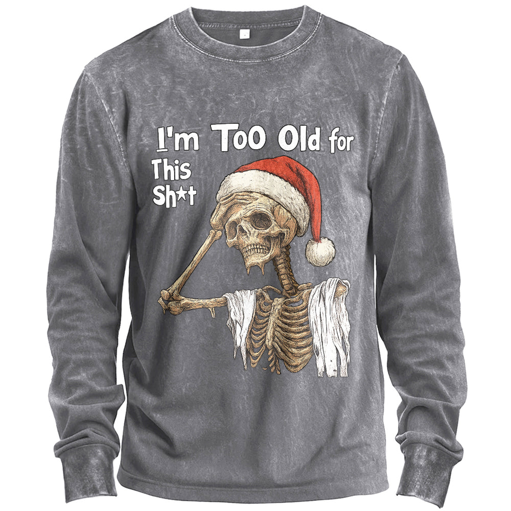 Regular price $29.99 USDGrumpy holiday mood, premium feel. This men’s long-sleeve T-shirt pairs a vintage-wash army-green body with a skeletal Santa and the line “I’m Too Old for This Sh*t.” Built for crisp DTG prints and everyday comfort.