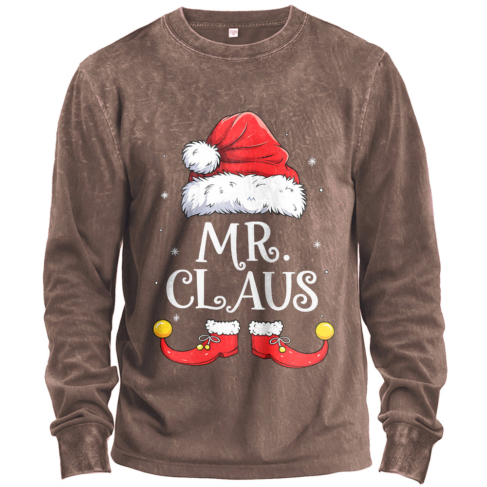 Festive and easy to wear. This men’s long-sleeve T-shirt pairs a vintage-wash army-green body with a playful “MR. CLAUS” graphic—Santa hat, snowflakes, and jolly boots—for holiday hangs and everyday comfort.