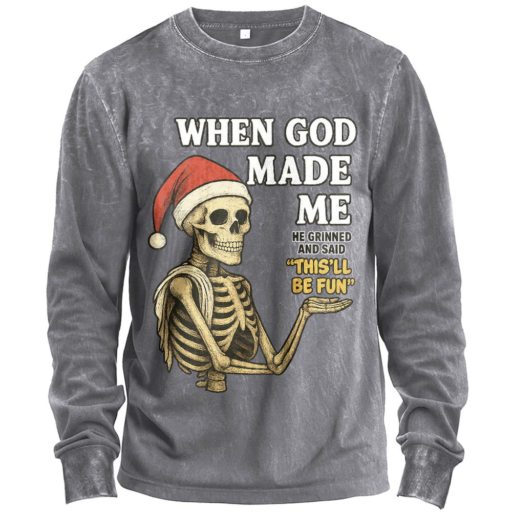 Snarky holiday spirit with a vintage vibe. This men’s long-sleeve T-shirt features a retro skeleton in a Santa hat with the line “When God Made Me, He Grinned and Said ‘This’ll Be Fun.’” The army-green body is vintage-washed for lived-in comfort and made to take crisp DTG prints.