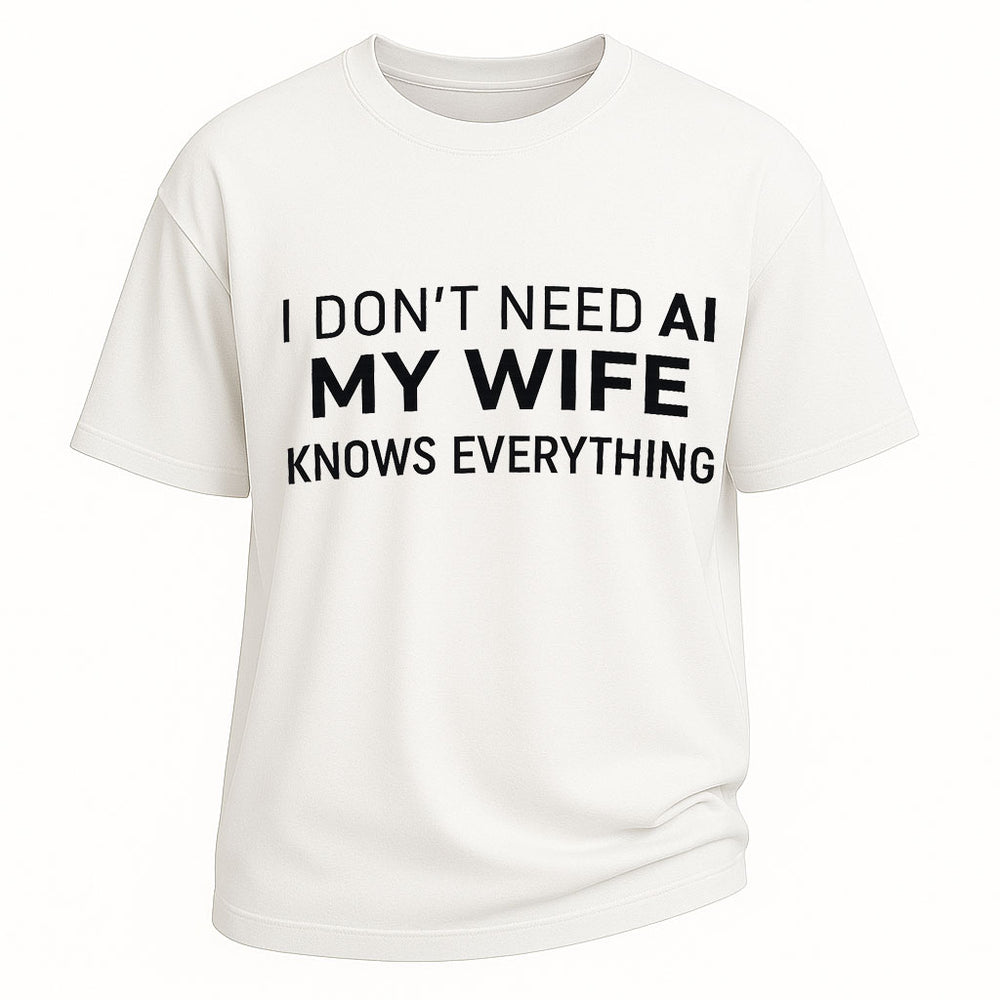 Regular price $26.99 USDBlend modern tech humor with family life in the LouMark "I Don’t Need AI, My Wife Knows Everything" graphic t-shirt. Featuring a witty slogan that pokes fun at artificial intelligence while celebrating family humor, this tee makes a playful and stylish statement. Made with premium heavy-weight cotton, it provides oversized comfort, breathability, and durability for everyday wear.