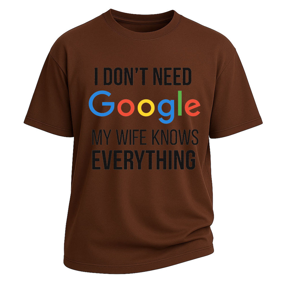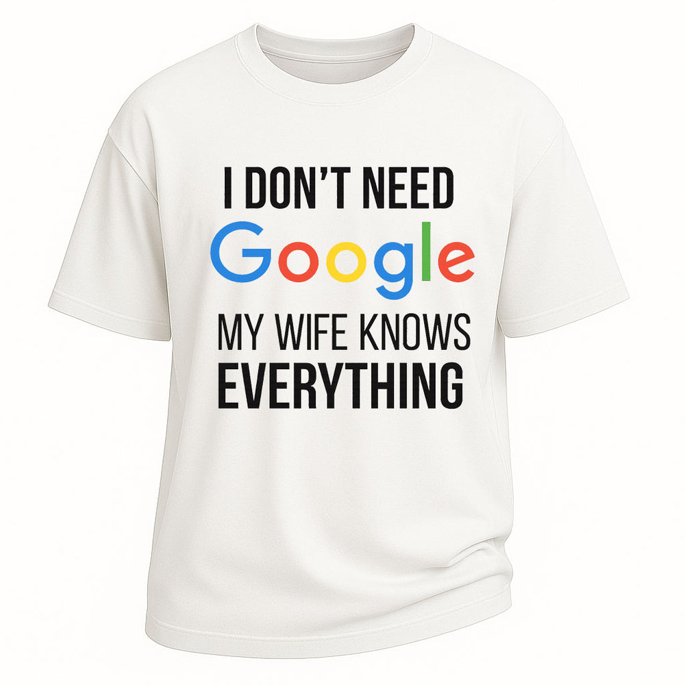 Show off humor and love with the LouMark "I Don’t Need Google, My Wife Knows Everything" graphic t-shirt. Featuring a clever slogan that blends tech culture with family life, this tee makes a perfect gift for husbands who appreciate sarcasm and fun. Made from premium heavy-weight cotton, it offers breathable comfort, oversized fit, and a classic crew neck design for casual everyday wear.