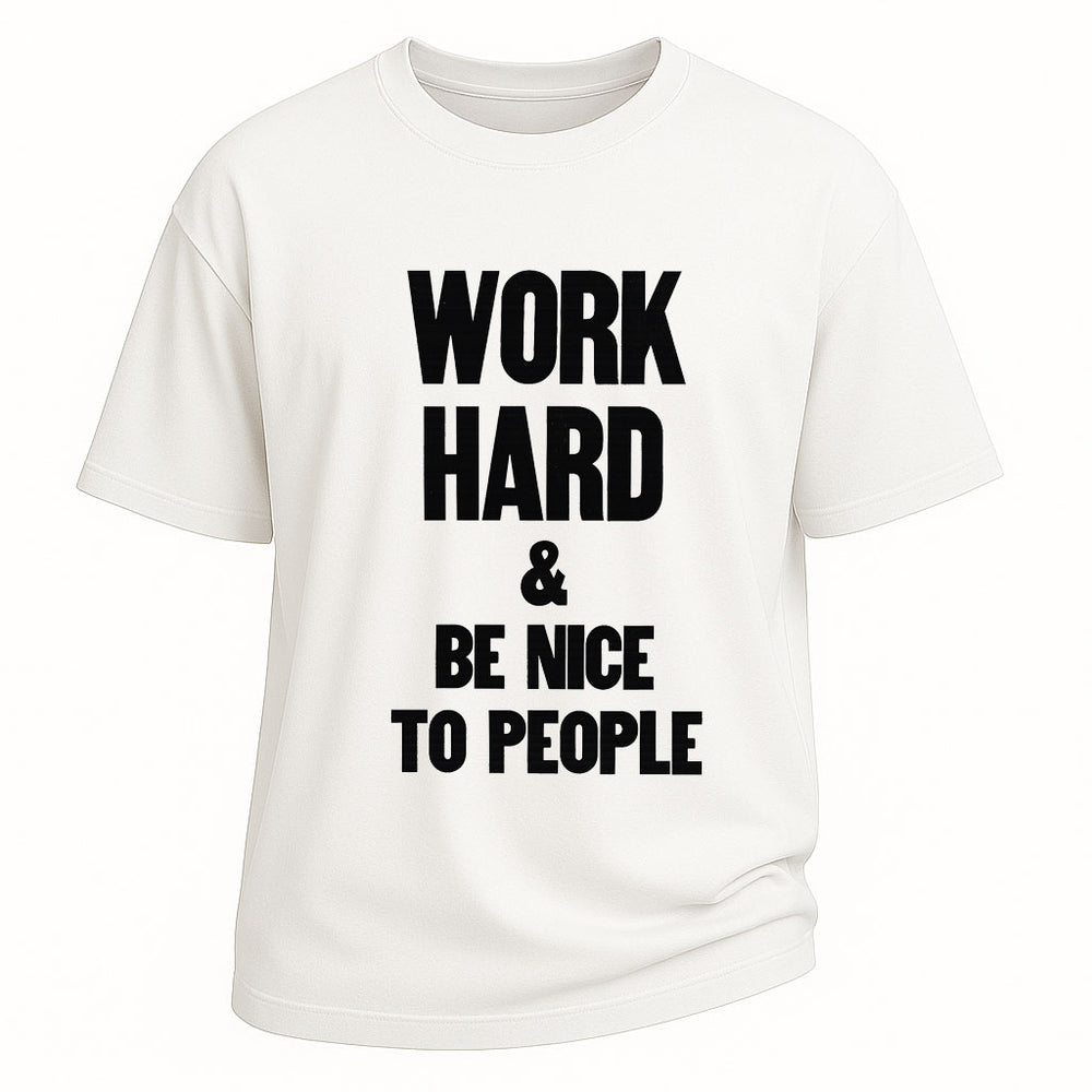 Regular price $26.99 USDKeep motivation simple and stylish with the LouMark "Work Hard & Be Nice To People" graphic t-shirt. Carrying a bold positive message, this tee is perfect for those who value determination and kindness. Made with heavy-weight cotton for lasting comfort, it offers an oversized fit and a timeless crew neck design, blending casual ease with meaningful attitude.