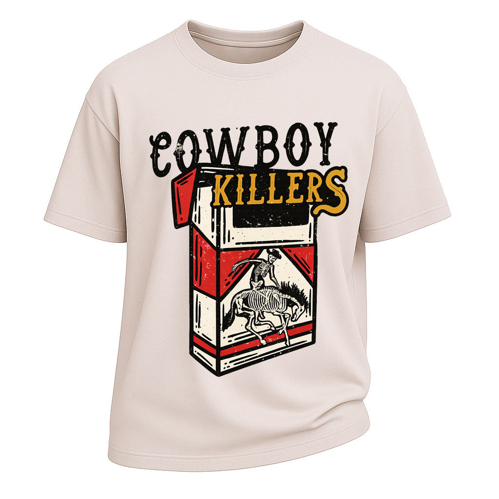 Regular price $26.99 USDBold, rebellious, and unapologetically western — the LouMark "Cowboy Killers" t-shirt is a nod to outlaw culture and vintage Americana. Featuring a striking cigarette box design with cowboy illustration, this tee delivers a rugged retro vibe that stands out in any crowd. Made from 260G heavy-weight 100% cotton, it ensures durability, comfort, and an oversized fit perfect for modern streetwear or casual western style.