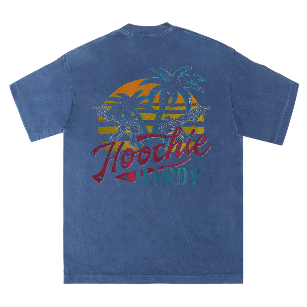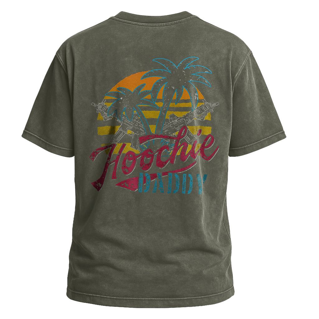 Celebrate vintage vibes with LouMark’s Hoochie Daddy Vintage Tee. This washed brown shirt features a retro-style back graphic of a sunset with palm trees, overlaid with the cursive text “Hoochie Daddy” in faded red and teal tones. Made from 100% cotton for comfortable casual wear with nostalgic style.