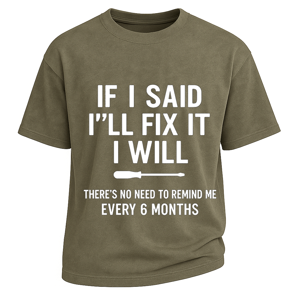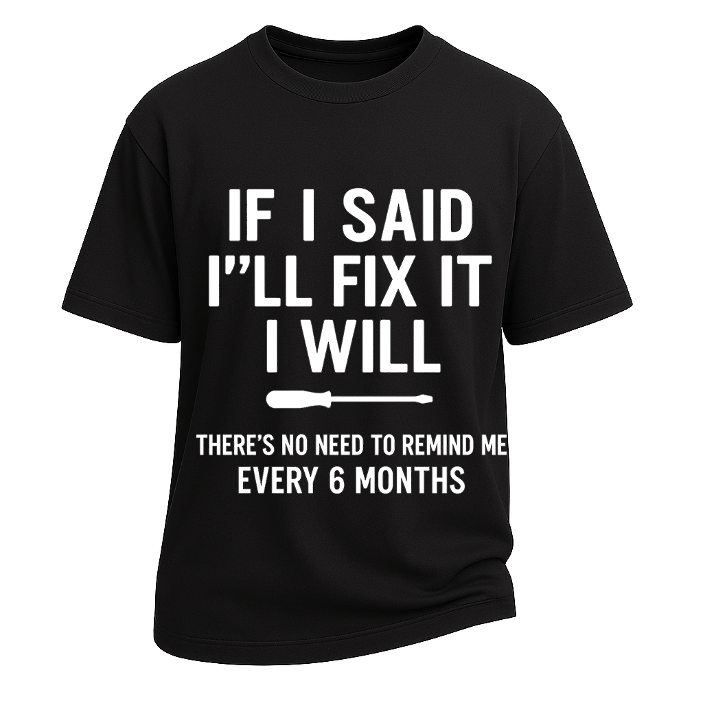 A shirt that speaks the universal language of every hands-on guy: “If I said I’ll fix it, I will—there’s no need to remind me every 6 months.” Whether you're actually planning to fix it or just holding the line, this tee has your back—with a side of humor.