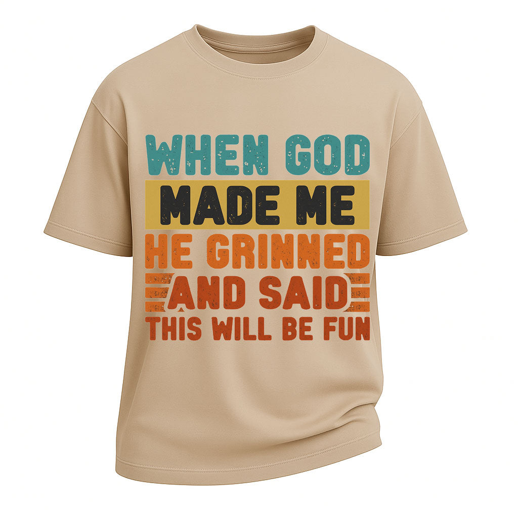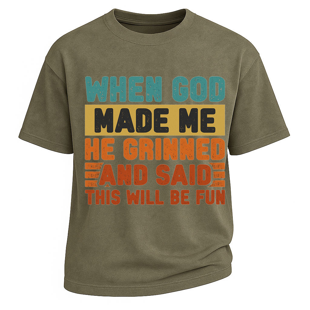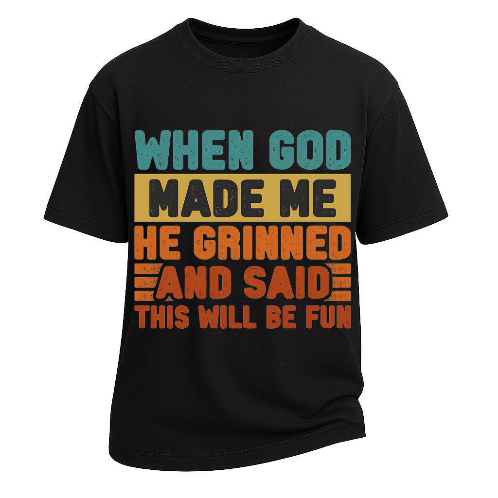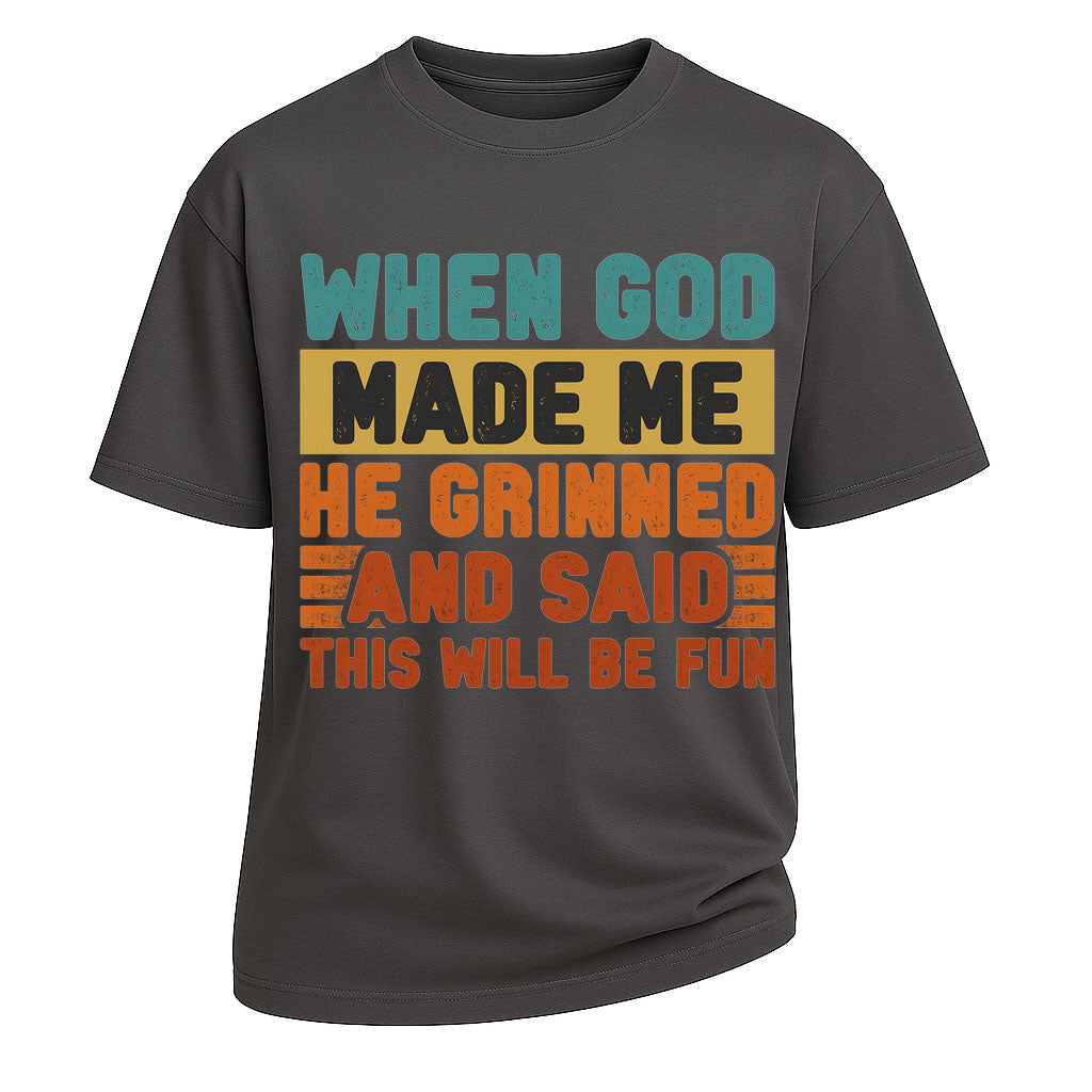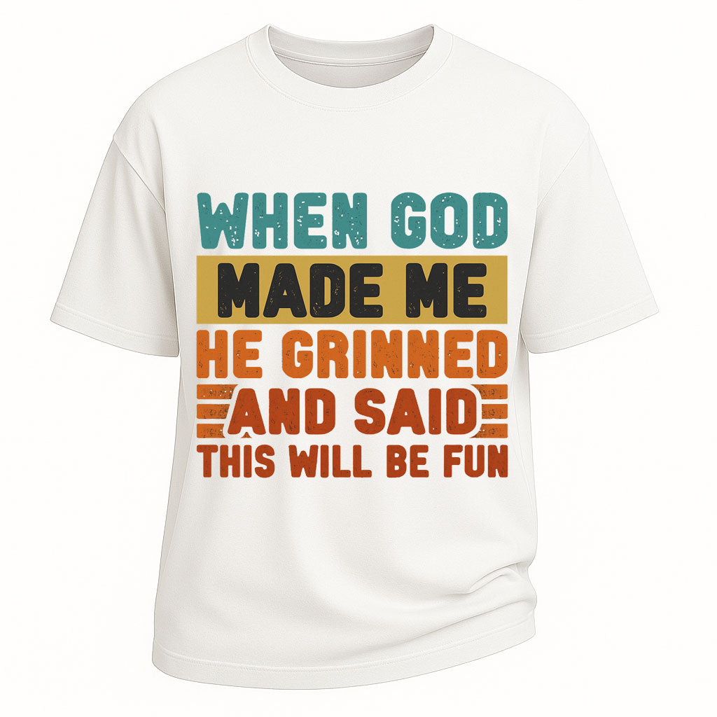 Regular price $26.99 USDStep into humor and comfort with LouMark’s “When God Made Me, He Grinned and Said This Will Be Fun” Tee. Made from 260G pure cotton with an oversized fit, this shirt ensures durability, softness, and style. The bold block lettering in vibrant blue, orange, and red makes a confident statement, perfect for anyone who enjoys playful faith-inspired humor and casual fashion.