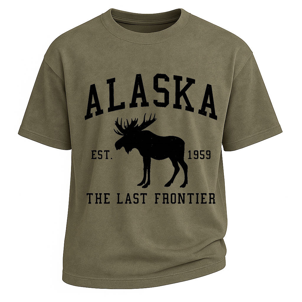 Regular price $26.99 USDHonor the wild soul of America’s last frontier with this Alaska-themed LouMark tee. Featuring a bold black moose silhouette and collegiate lettering, this shirt pays tribute to the raw landscapes and rugged spirit of the 49th state. Printed on a durable 260g heavyweight cotton fabric, it's made for those who find freedom where the road ends and the wilderness begins. The muted military green tone makes it a go-to for outdoor lovers and patriotic souls alike.