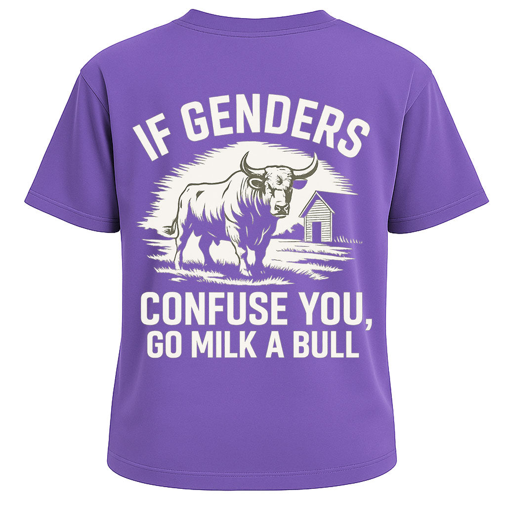 Regular price $26.99 USDBold, brash, and designed to stir the pot—this tee features a vintage woodcut-style bull and barn graphic, paired with the provocative phrase: “If genders confuse you, go milk a bull.” Whether worn in humor or protest, it’s sure to start a conversation.