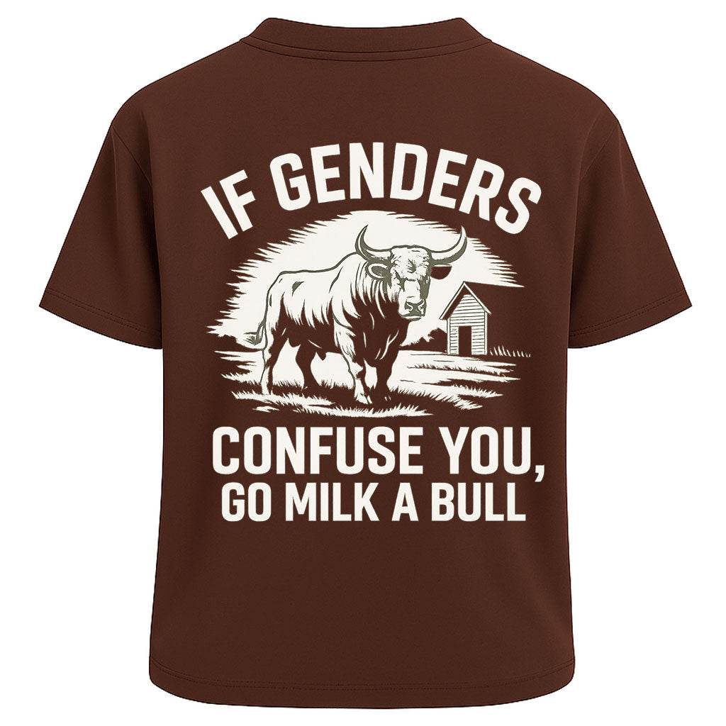 Bold, brash, and designed to stir the pot—this tee features a vintage woodcut-style bull and barn graphic, paired with the provocative phrase: “If genders confuse you, go milk a bull.” Whether worn in humor or protest, it’s sure to start a conversation.