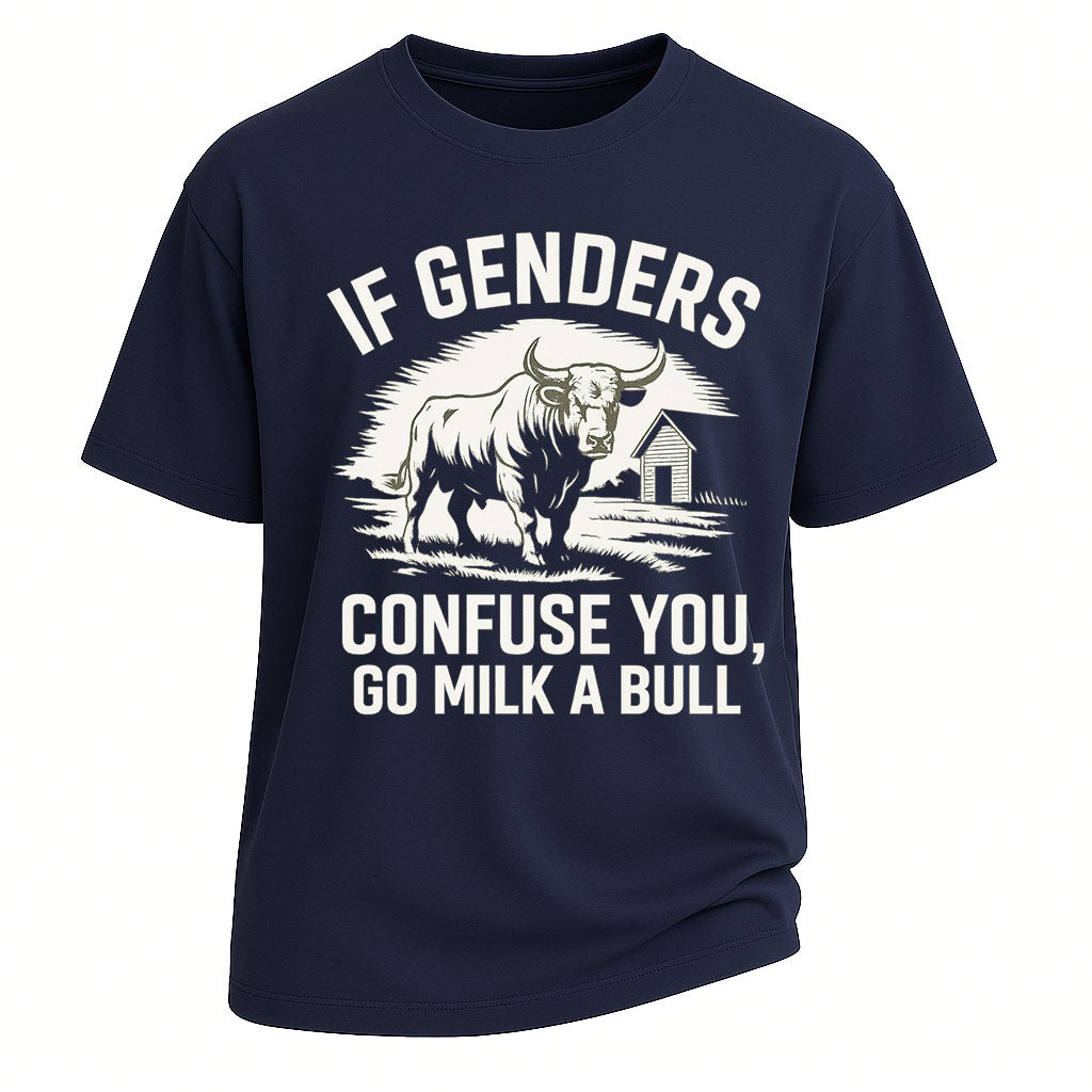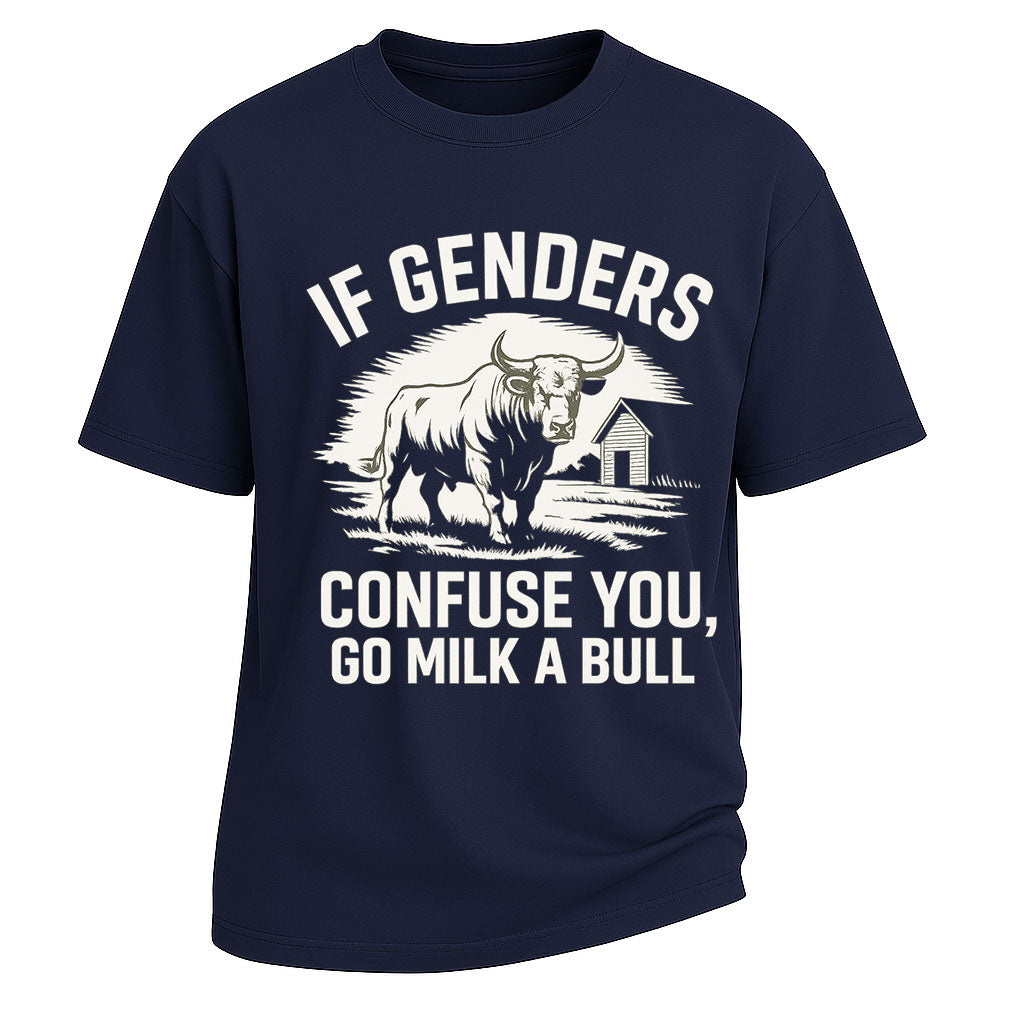 Blunt, bold, and built to stir the pot—this LouMark tee doesn’t mince words. Featuring a classic Western bull illustration and the hard-hitting slogan “If Genders Confuse You, Go Milk a Bull,” it’s made for men who speak their mind and stand their ground.