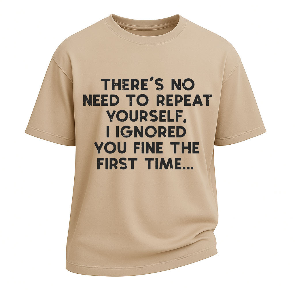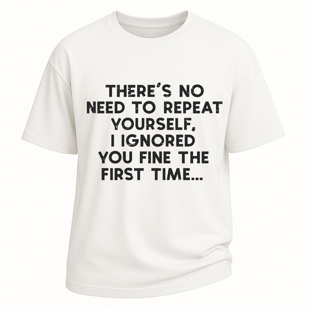 Regular price $26.99 USDBring sarcasm into your style with this Ignored You slogan short-sleeve t-shirt. Made from 260G 100% cotton, this heavyweight tee ensures long-lasting comfort and durability. The witty text print reads “THERE’S NO NEED TO REPEAT YOURSELF. I IGNORED YOU FINE THE FIRST TIME…,” creating a bold and humorous statement. With its standard fit and crew neckline, this tee is ideal for casual wear, parties, and streetwear looks.