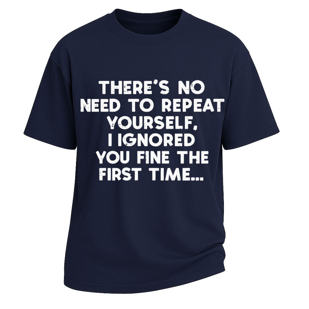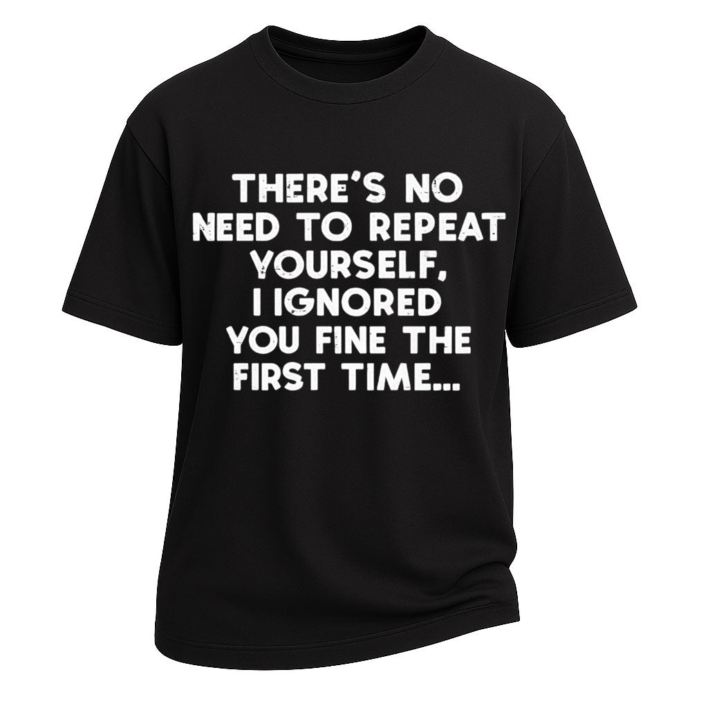 Bring sarcasm into your style with this Ignored You slogan short-sleeve t-shirt. Made from 260G 100% cotton, this heavyweight tee ensures long-lasting comfort and durability. The witty text print reads “THERE’S NO NEED TO REPEAT YOURSELF. I IGNORED YOU FINE THE FIRST TIME…,” creating a bold and humorous statement. With its standard fit and crew neckline, this tee is ideal for casual wear, parties, and streetwear looks.