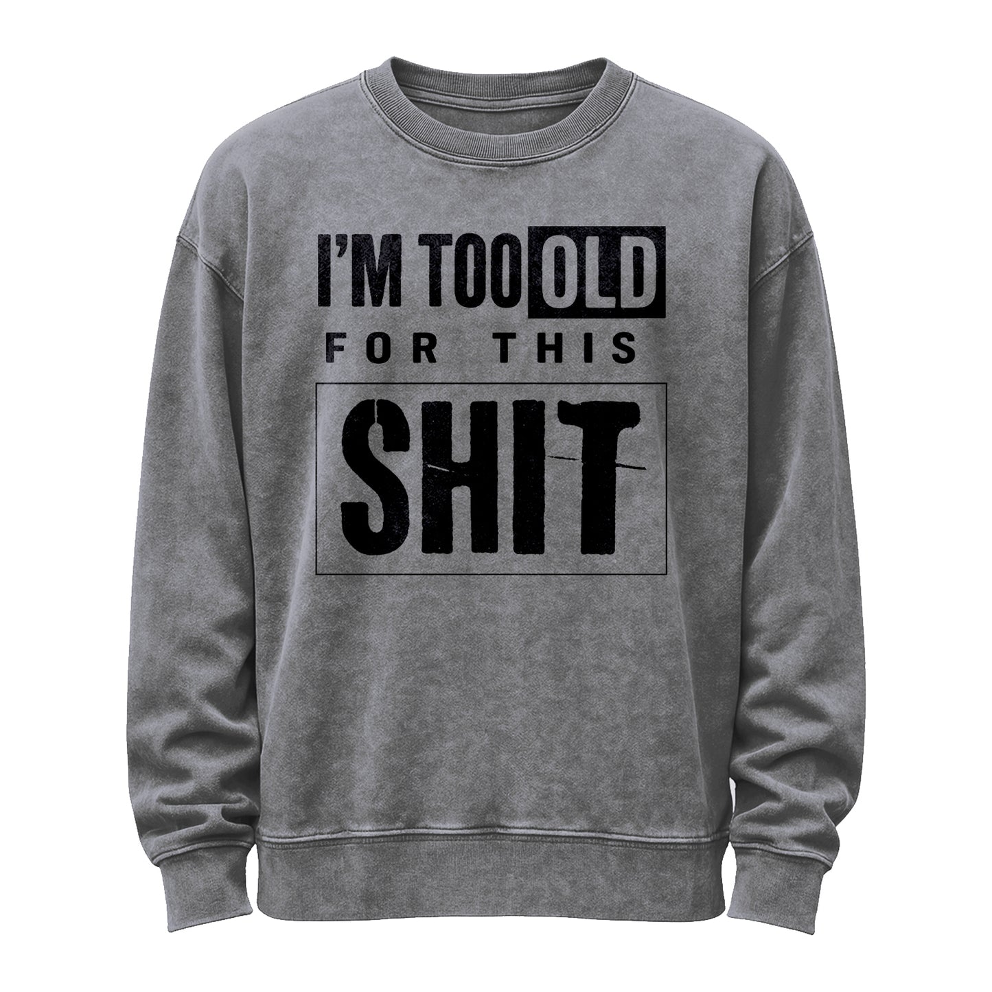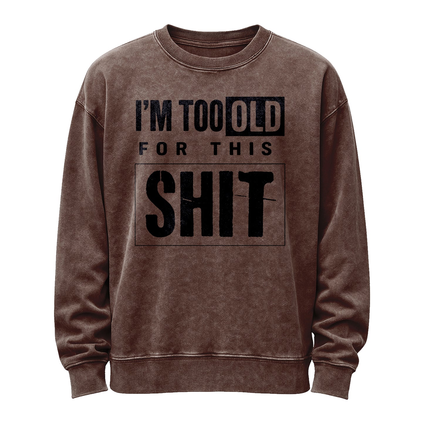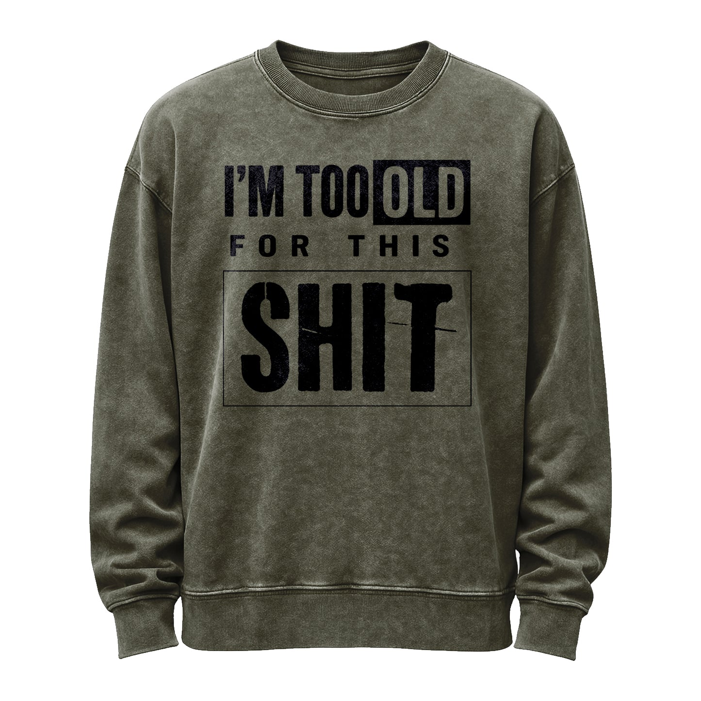 This vintage washed army-green crewneck stacks bold, distressed black typography—“I’M TOO OLD FOR THIS”—above an oversized boxed “SH*T” for a cheeky, no-nonsense vibe.