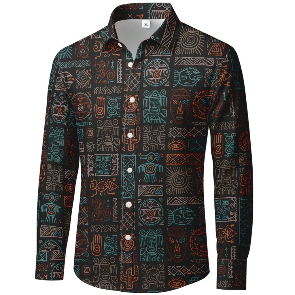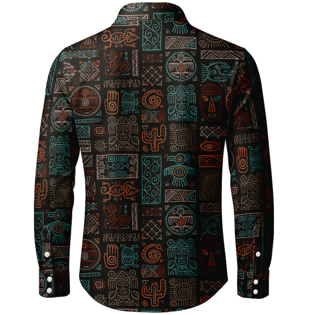 Ancient-meets-modern. This long-sleeve button-up features an allover grid of tribal-style glyphs—masks, suns, spirals, hands, cactus, and geometric marks—outlined in teal, burnt orange, and sand on deep black. The smooth 100% polyester fabric is lightweight, wrinkle-resistant, and quick-drying, ideal for streetwear looks, creative offices, festivals, and travel.