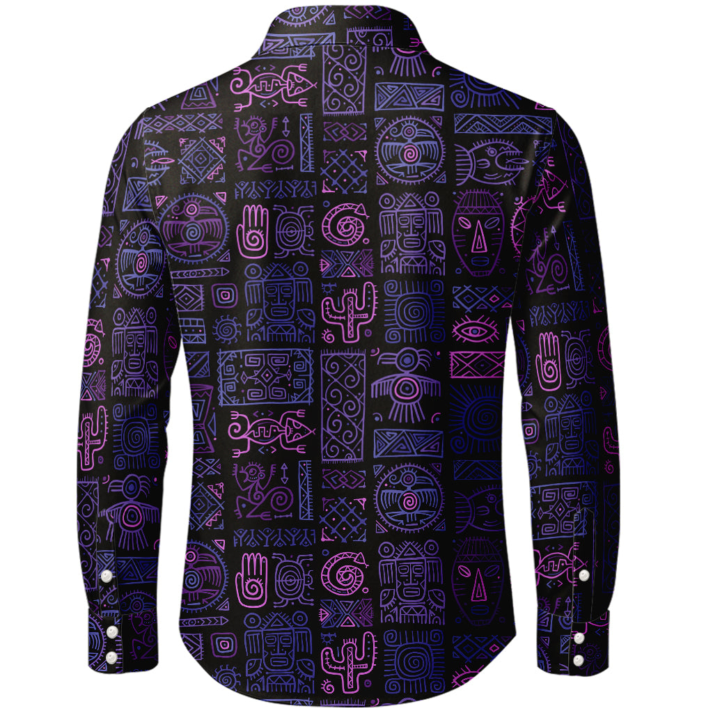 Regular price $29.99 USDAncient-meets-modern. This long-sleeve button-up features an allover grid of tribal-style glyphs—masks, suns, spirals, hands, cactus, and geometric marks—outlined in teal, burnt orange, and sand on deep black. The smooth 100% polyester fabric is lightweight, wrinkle-resistant, and quick-drying, ideal for streetwear looks, creative offices, festivals, and travel.