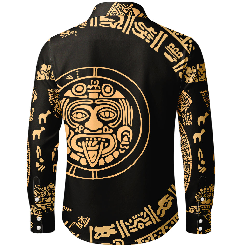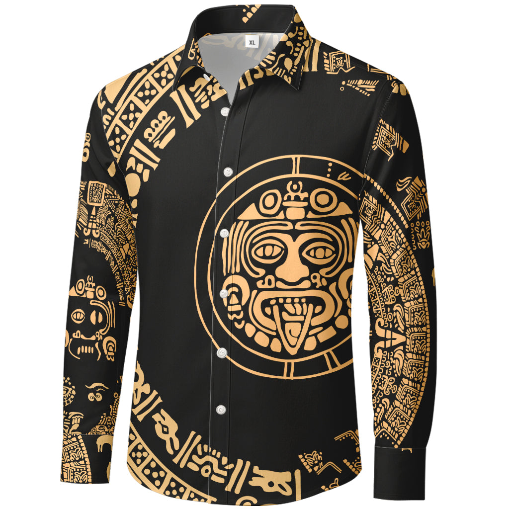 Own the room with this striking long-sleeve button-up featuring an oversized gold Aztec calendar motif across deep black. The art wraps around the torso and sleeves for a gallery-level statement. Printed edge-to-edge by sublimation, the design stays vivid and crisp wash after wash. The smooth 100% polyester fabric is lightweight, wrinkle-resistant, and quick-drying—ideal for travel, parties, and bold everyday style.