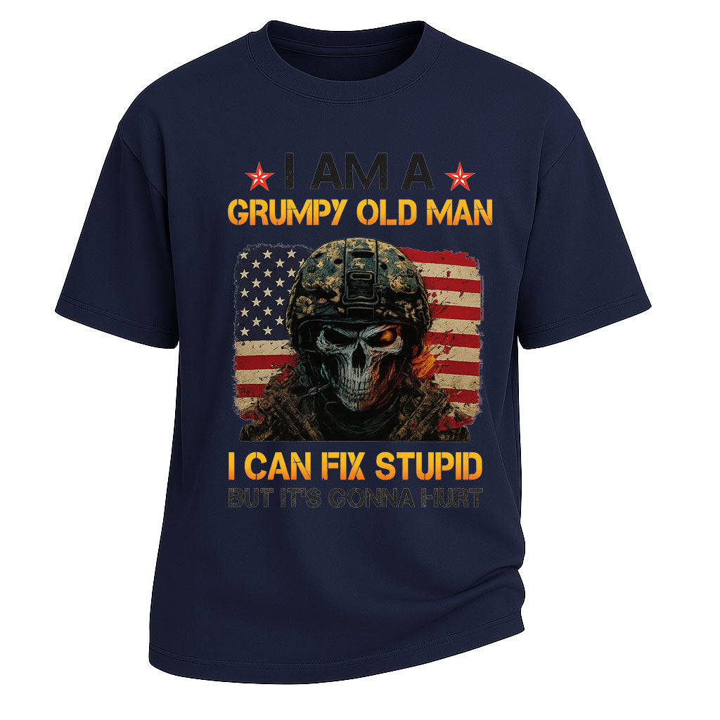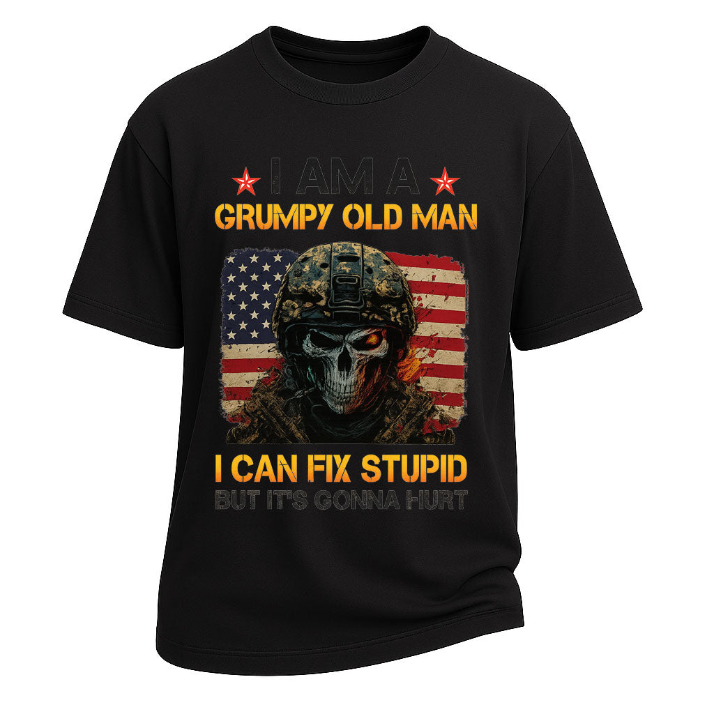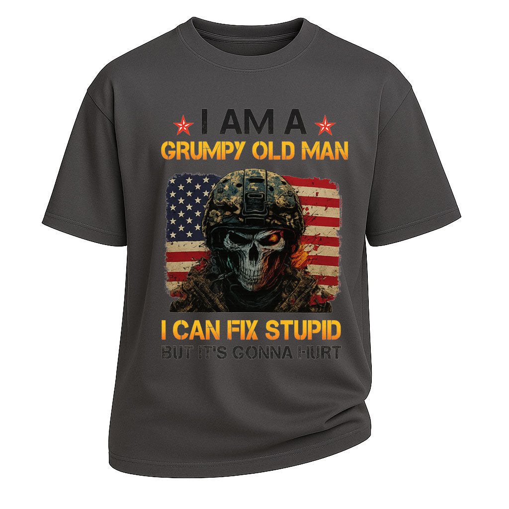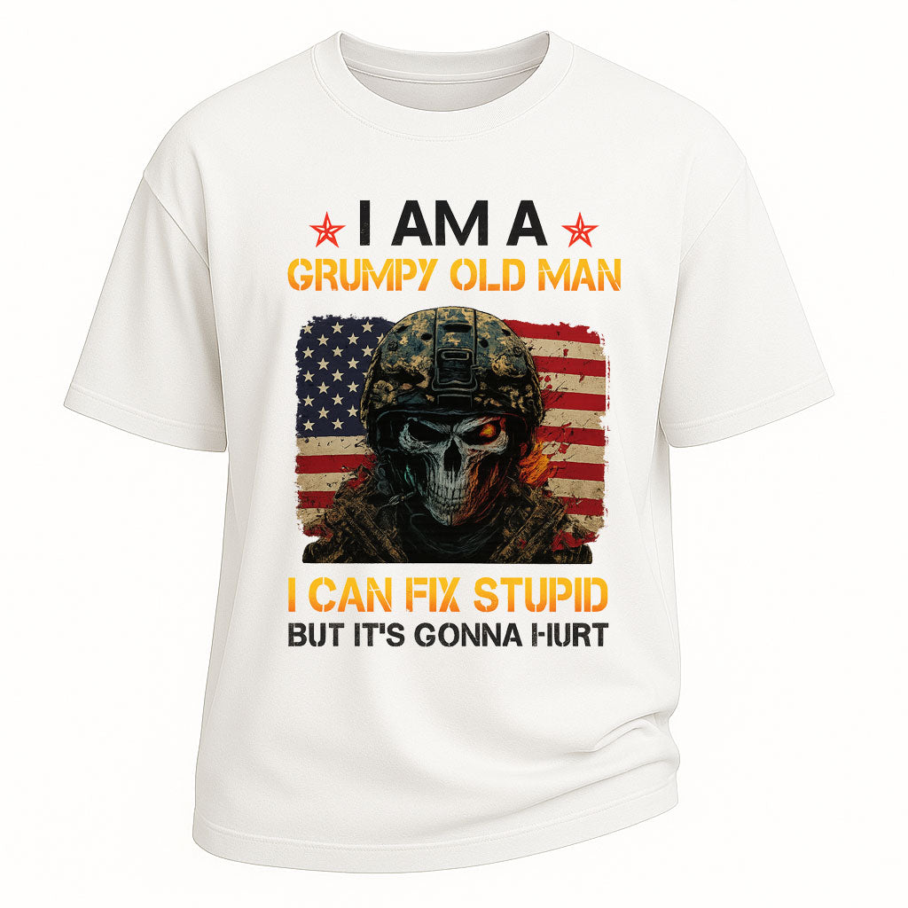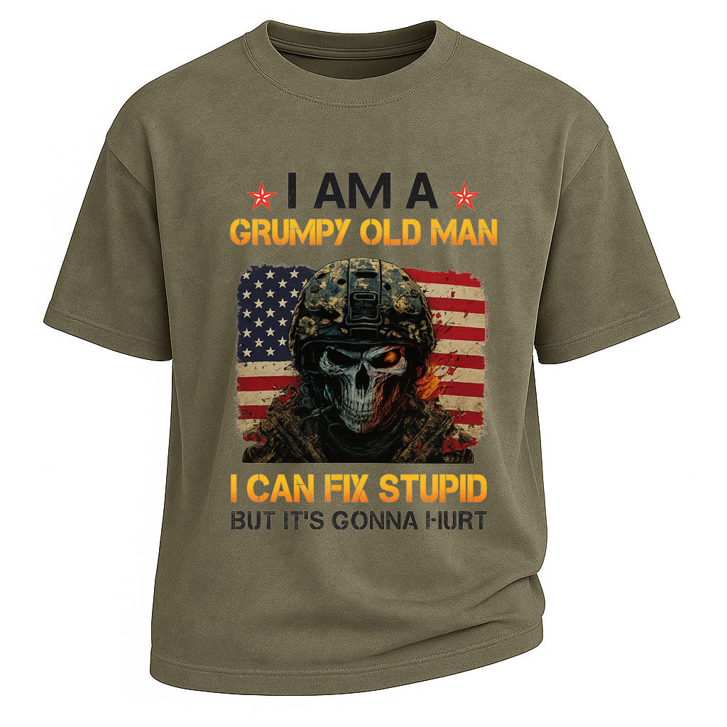 Regulärer Preis $26.99 USDTurn up the attitude with this Grumpy Old Man Fix Stupid graphic short-sleeve t-shirt. Made from 260G 100% cotton, this heavyweight tee offers both comfort and lasting wear. The striking design showcases a skull soldier in front of the American flag with the bold slogan “I AM A GRUMPY OLD MAN – I CAN FIX STUPID BUT IT’S GONNA HURT,” making it a statement piece with edgy humor. With its standard fit and classic crew neckline, it’s perfect for streetwear, casual outings, or themed parties.