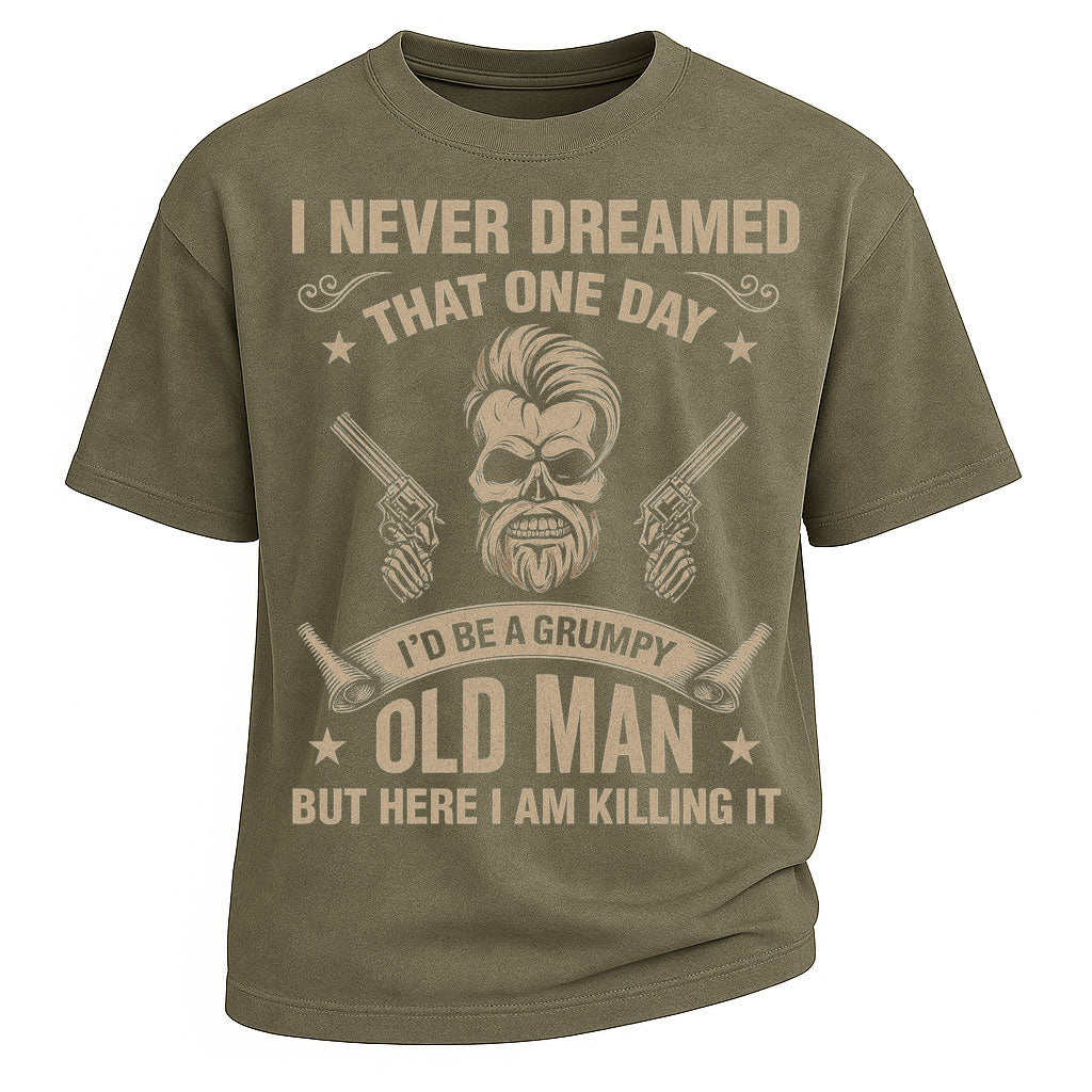 Embrace the humor of age with LouMark’s Grumpy Old Man Killing It Tee. Crafted from heavy 260G 100% cotton, this oversized T-shirt offers a relaxed fit with rugged durability. The design features bold lettering with the phrase “I NEVER DREAMED THAT ONE DAY I’D BE A GRUMPY OLD MAN BUT HERE I AM KILLING IT,” flanked by pistols and a bearded skull graphic. A perfect mix of attitude, humor, and timeless character.