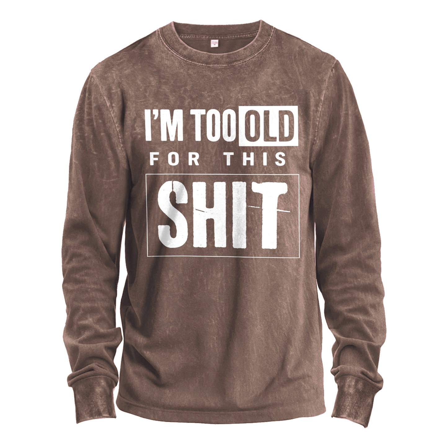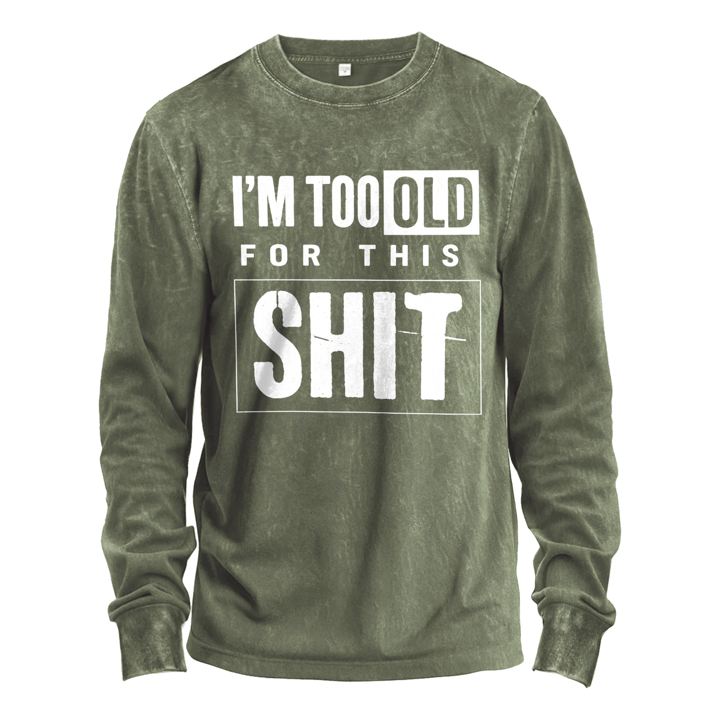 Blunt truth in bold type. This vintage-washed army-green long-sleeve T-shirt features big distressed white lettering that reads “I’M TOO OLD FOR THIS SHIT.” Cut from comfy 100% cotton for a soft, broken-in feel right out of the bag.