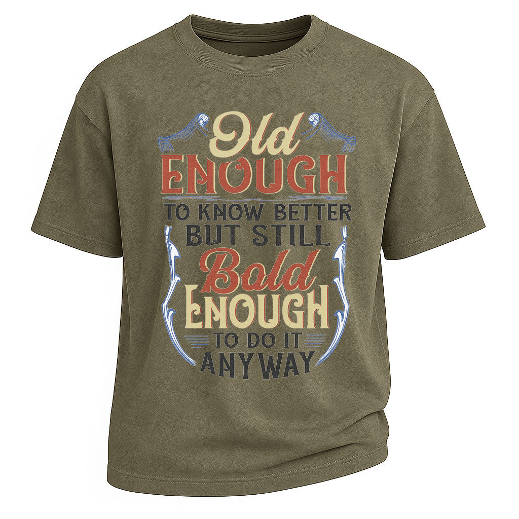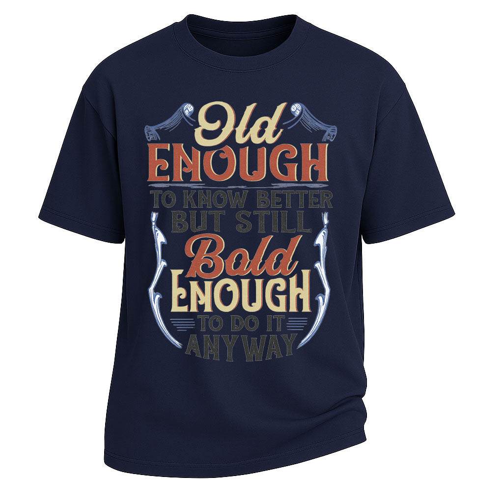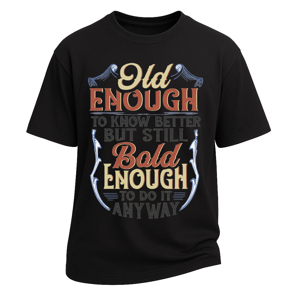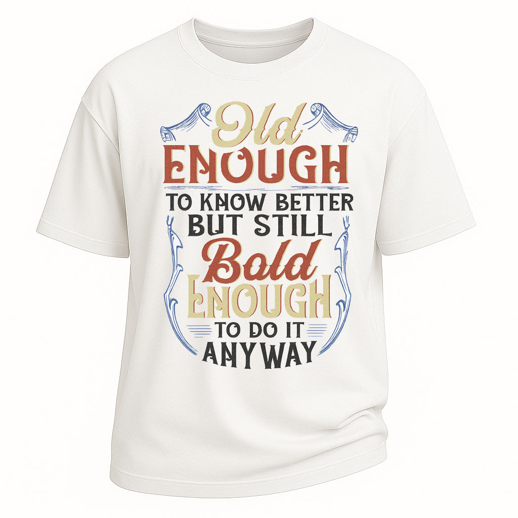 Embrace confidence and humor with this Old Enough Bold Enough slogan short-sleeve t-shirt. Made from 260G 100% cotton, this heavyweight tee provides a structured yet comfortable fit. The colorful print reads “Old Enough to Know Better But Still Bold Enough to Do It Anyway,” blending wit with bold personality. Featuring a standard fit and classic crew neckline, this tee is great for casual wear, parties, or streetwear styling.