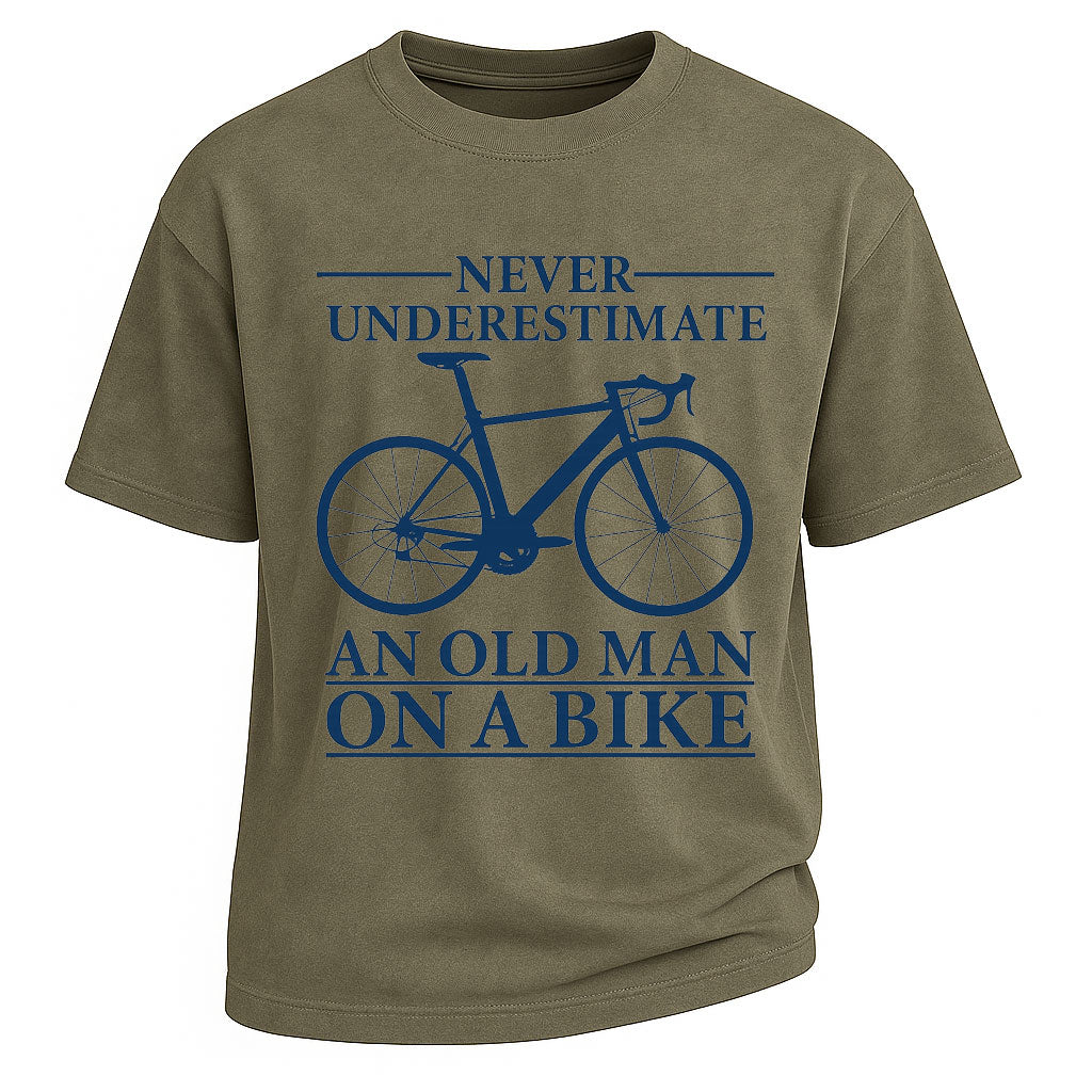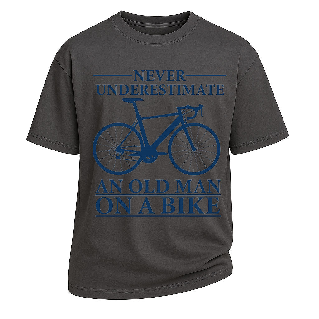 - Pattern: Slogan “Never Underestimate an Old Man on a Bike” with bicycle graphic
