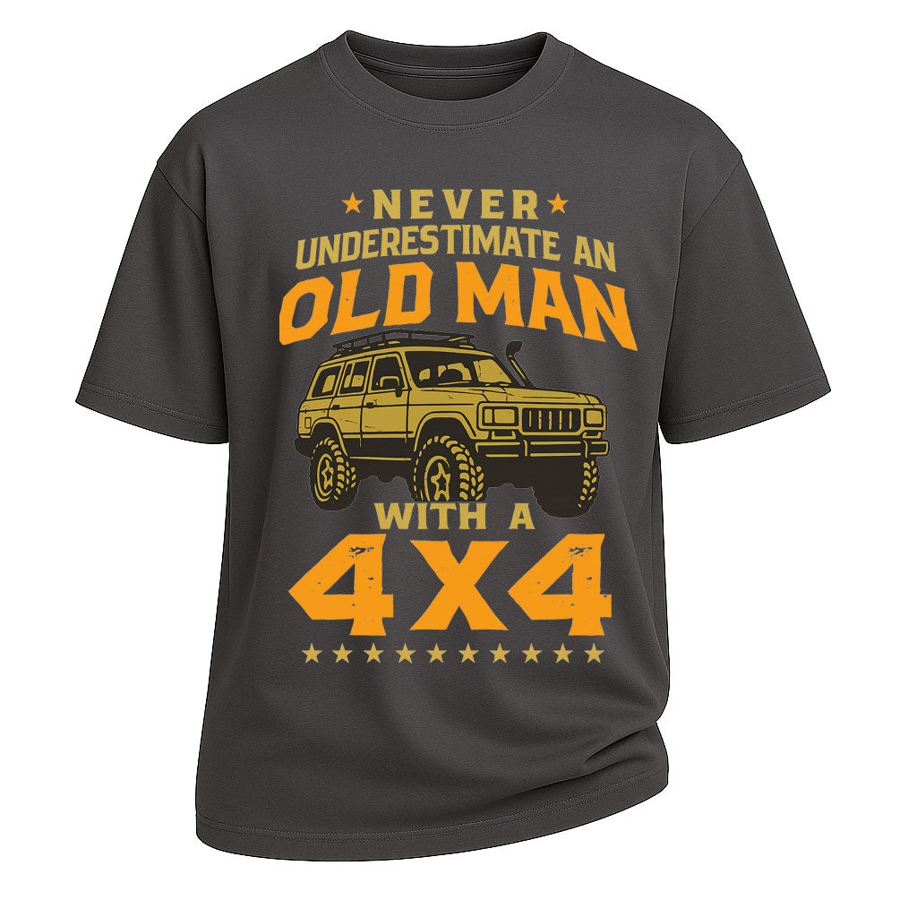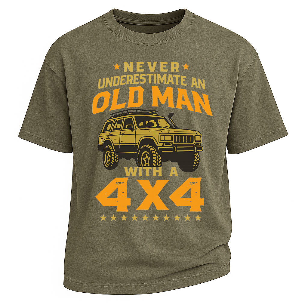 Bring rugged humor to your style with this Old Man With A 4x4 graphic short-sleeve t-shirt. Made from 260G 100% cotton, this heavyweight tee delivers comfort and durability. Featuring a bold off-road 4x4 vehicle illustration with the slogan “NEVER UNDERESTIMATE AN OLD MAN WITH A 4X4,” it blends vintage style with outdoor spirit. With its standard fit and crew neckline, it’s perfect for casual wear, outdoor adventures, and streetwear looks.