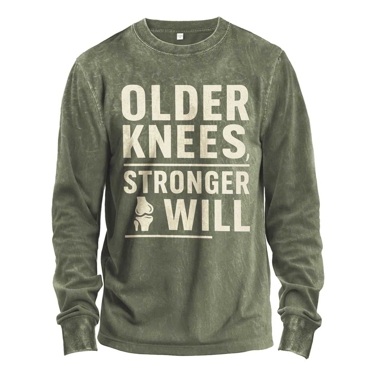 Vintage-washed military olive body with oversized, distressed bone/ivory typography reading “OLDER KNEES, STRONGER WILL,” accented by a knee joint icon and clean rule lines.