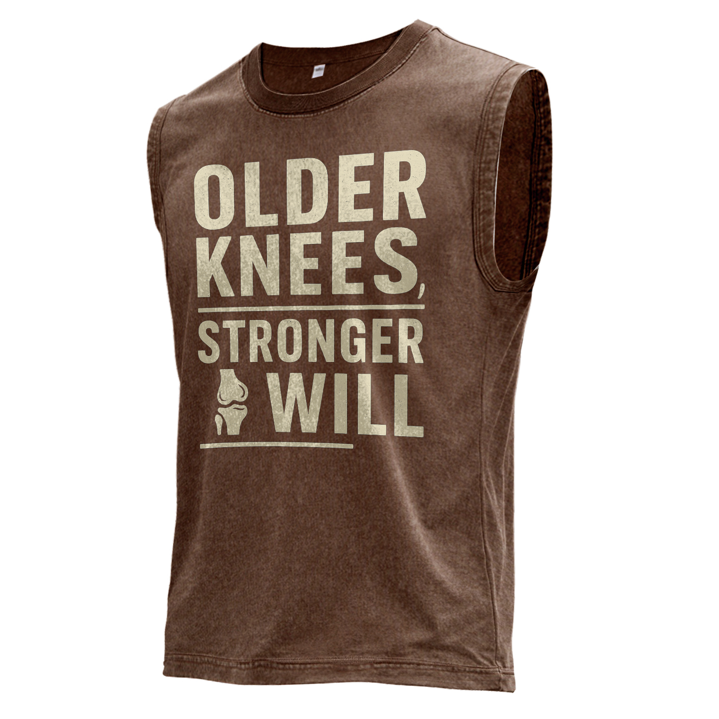 This vintage brown muscle tee features oversized, distressed bone/ivory typography reading “OLDER KNEES, STRONGER WILL,” accented by a knee joint icon and clean rule lines.