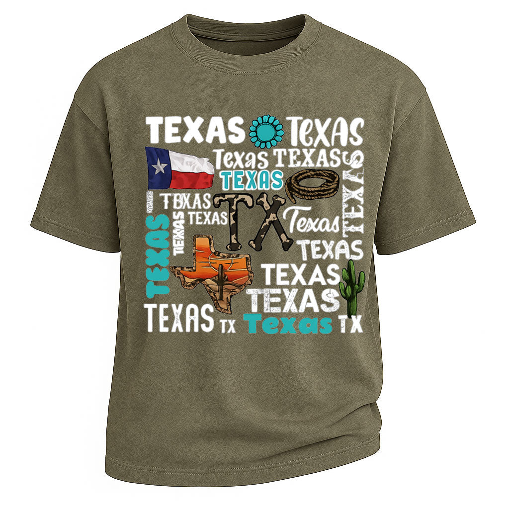 Regulärer Preis $26.99 USDShow off your Lone Star State pride with the LouMark "Texas Typography Collage" graphic t-shirt. Featuring a bold mix of Texas-themed text, symbols, and icons including the state map, cactus, and flag, this tee captures the energy of western culture and southern identity. Made from premium heavy-weight cotton, it delivers oversized comfort, breathable durability, and a classic crew neck cut, perfect for everyday wear or state-themed events.