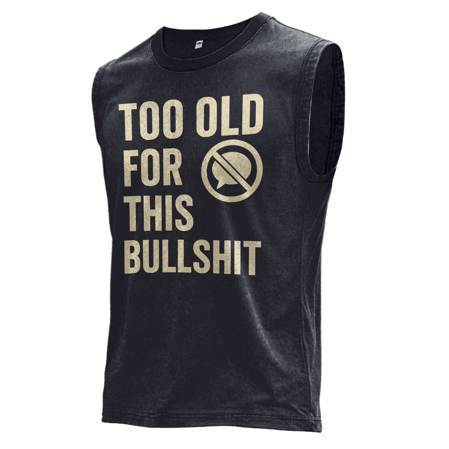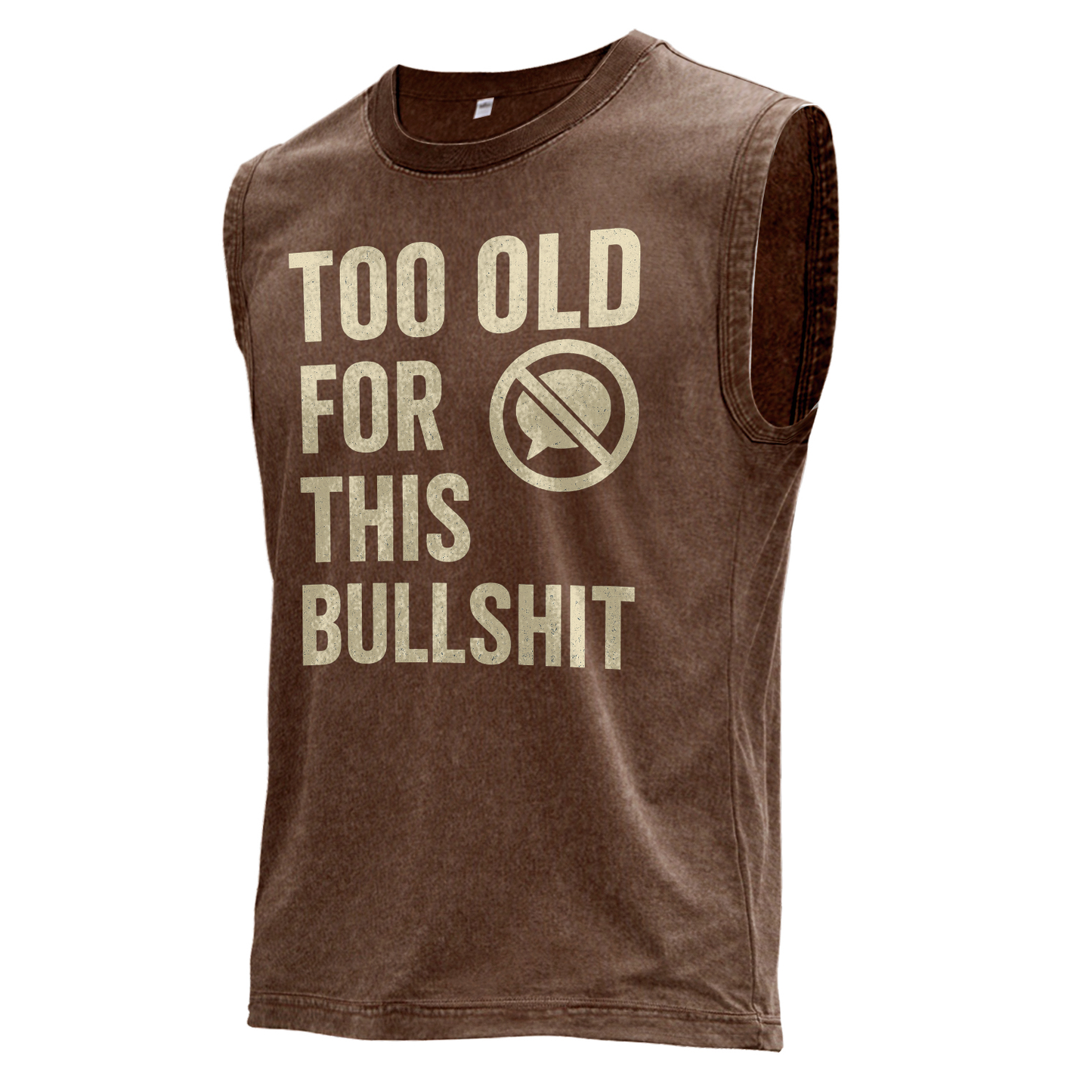 This vintage brown muscle tee features oversized, distressed bone/ivory typography reading “TOO OLD FOR THIS BULLSHIT,” paired with a crossed-out speech bubble icon for a zero-nonsense vibe.