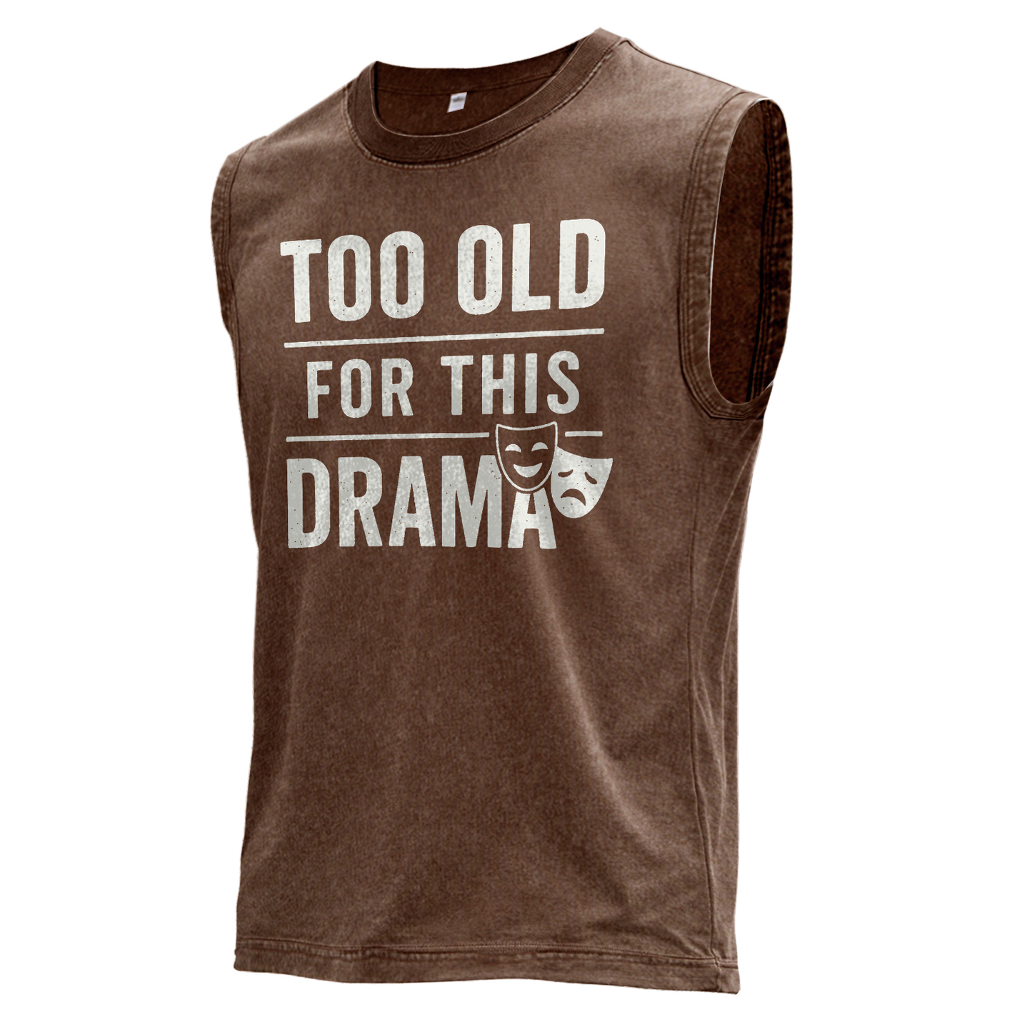 This vintage brown muscle tee features oversized, distressed white typography reading “TOO OLD / FOR THIS / DRAMA,” separated by clean rules and paired with classic comedy–tragedy masks.