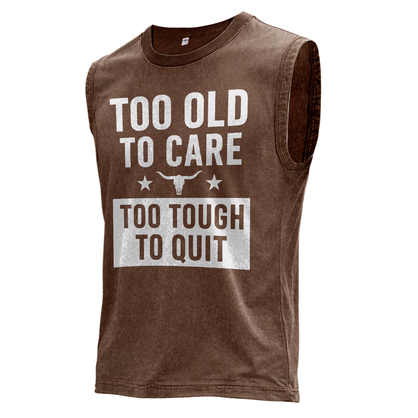 This vintage brown muscle tee features bold distressed white typography: “TOO OLD TO CARE” stacked above a block badge reading “TOO TOUGH TO QUIT,” flanked by stars and a longhorn skull icon.