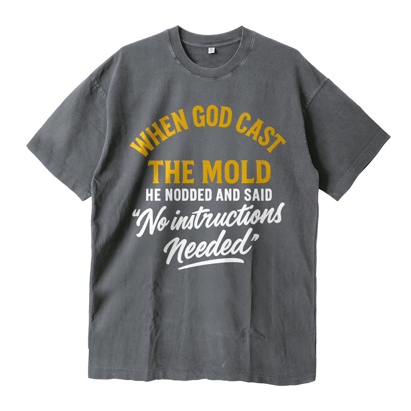 Own your one-of-a-kind spirit. LouMark’s When God Cast The Mold Tee stacks bold gold and white typography that reads: “WHEN GOD CAST THE MOLD — HE NODDED AND SAID ‘No instructions needed.’” Cut from dense 260g cotton with a washed black finish, this relaxed tee brings day-one comfort and a confident faith-forward vibe.