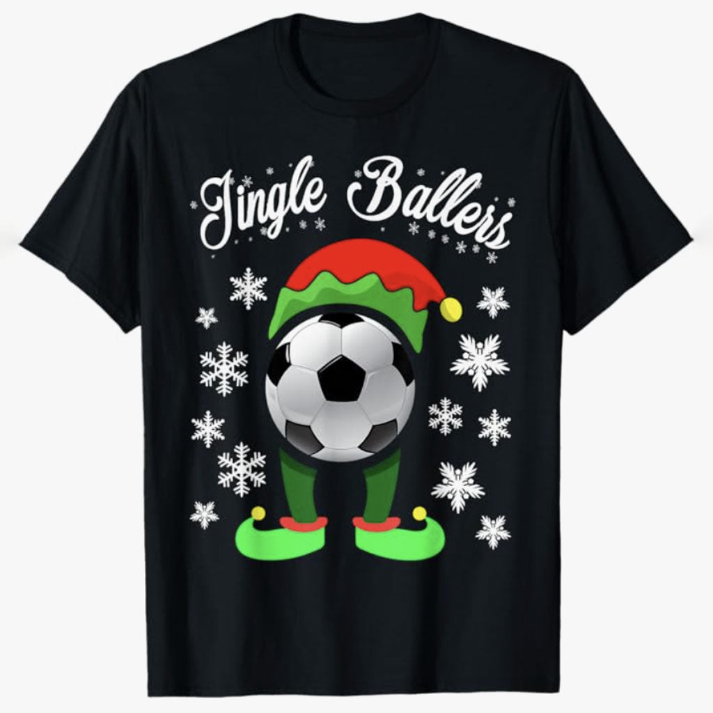 Score a laugh this holiday season with this punny graphic tee! It features a Christmas elf dressed up and holding a soccer ball, with the clever text "Jingle Baller." Perfect for soccer players, fans, coaches, or anyone who loves Christmas humor.