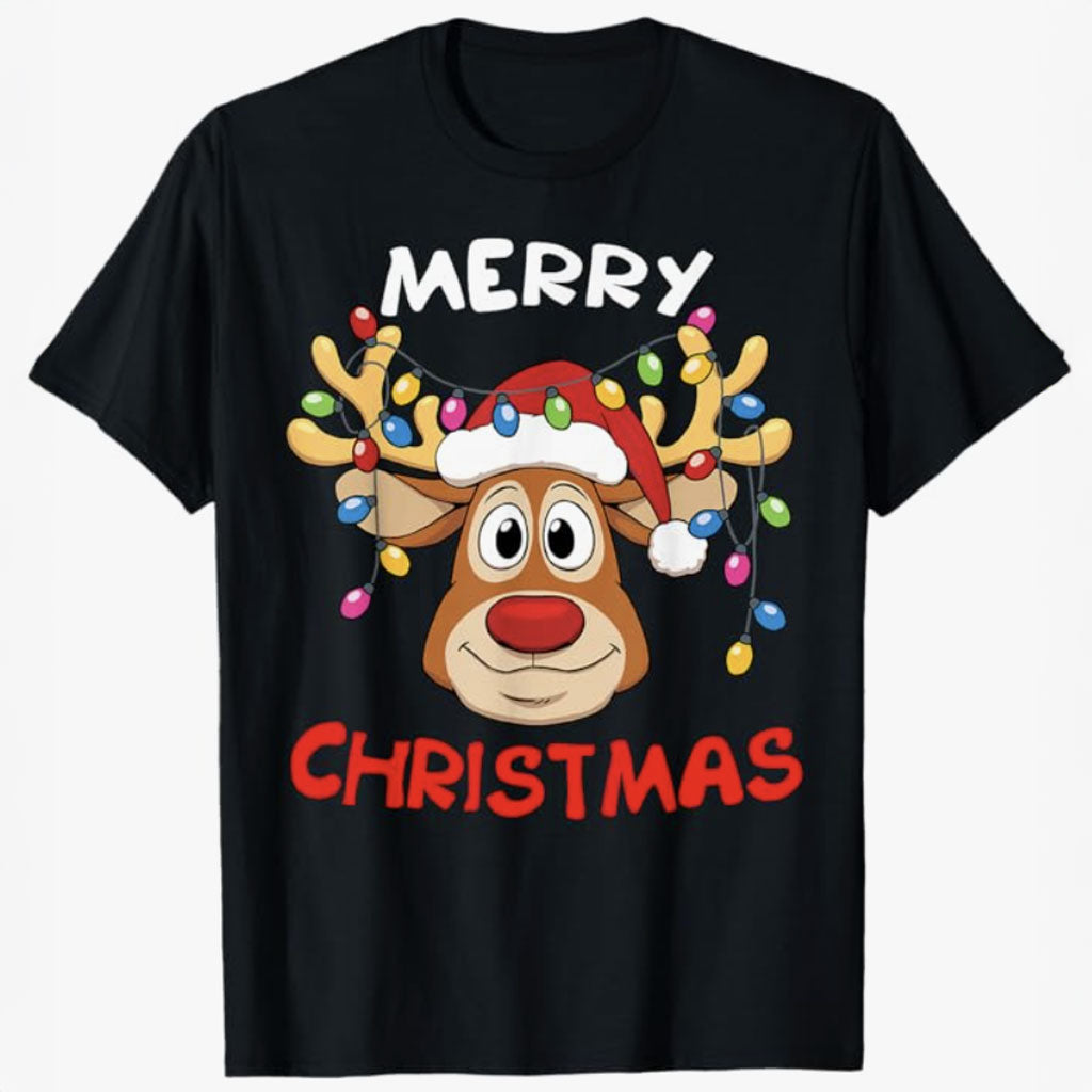Get festive with this fun and cheerful holiday graphic tee! It features a smiling reindeer wearing a Santa hat, with colorful Christmas lights wrapped around its antlers, and the text "MERRY CHRISTMAS." A perfect shirt for Christmas celebrations.