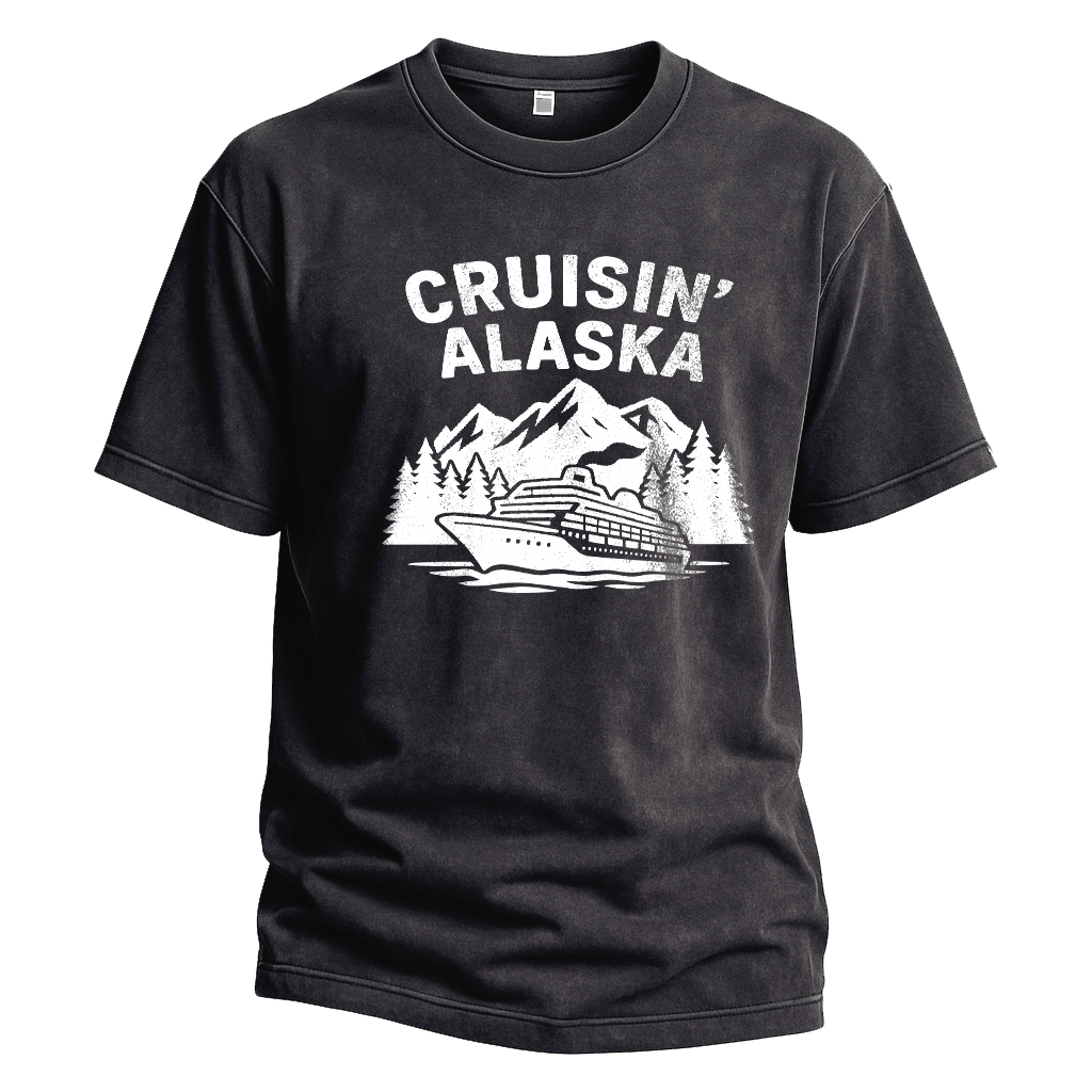 A chill breeze, towering pines, and a cruise liner carving through icy waters — it’s Alaska, your way. This clean and minimalist tee features a bold graphic of a cruise ship sailing past mountain peaks and forest silhouettes, all under the proud headline: “Cruisin’ Alaska.” It’s a perfect souvenir or wearable memory for your northern escape.