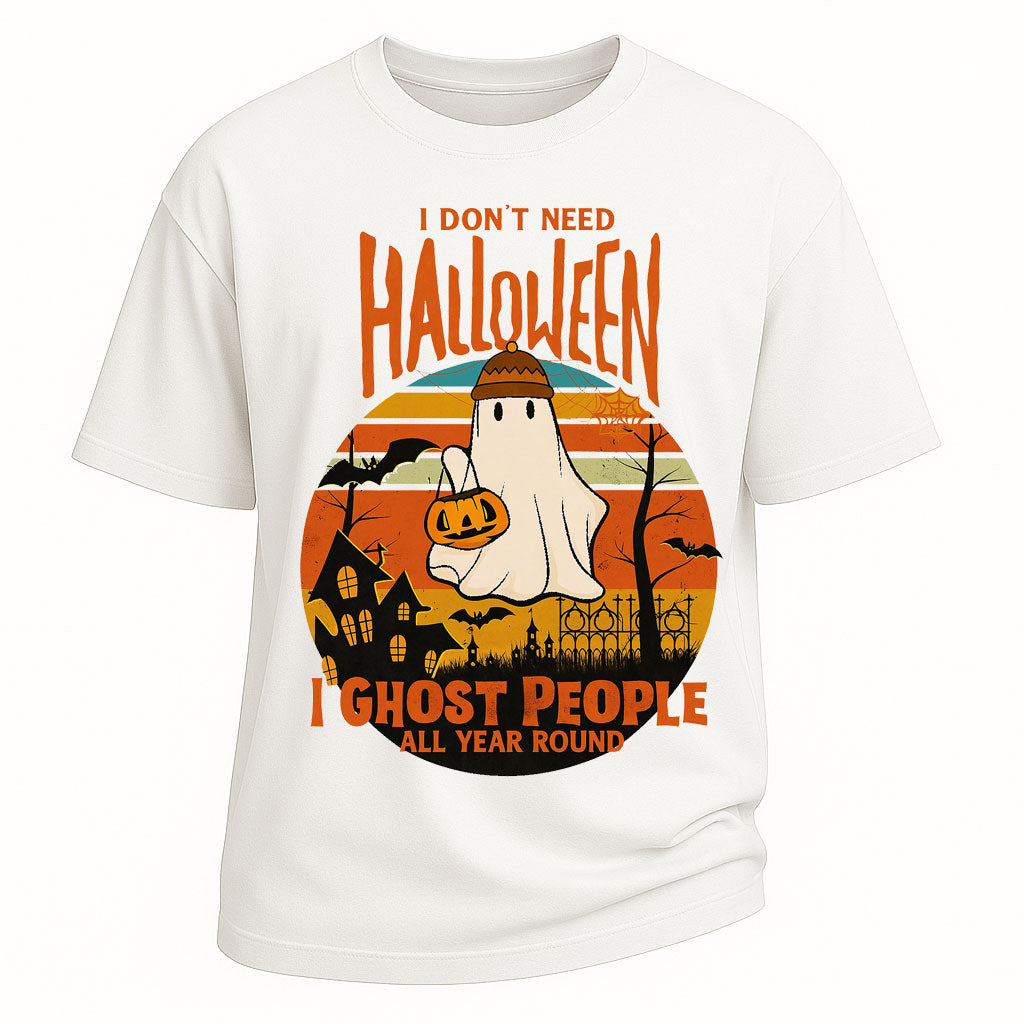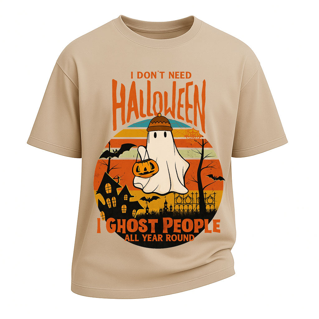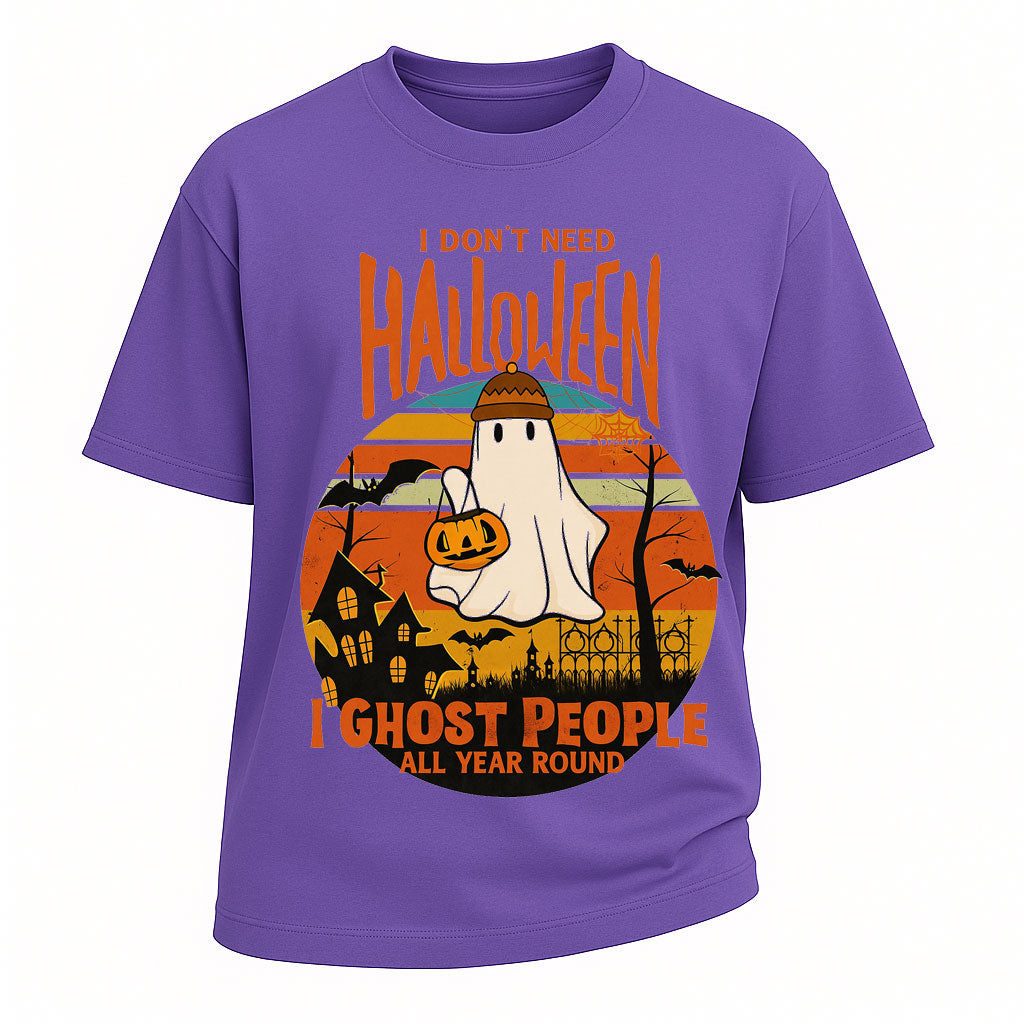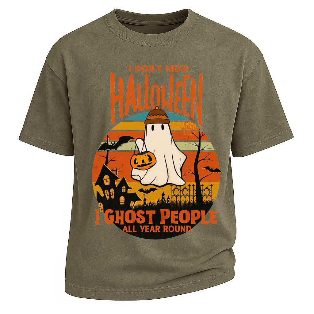 Show off your year-round spooky humor with LouMark’s “I Don’t Need Halloween, I Ghost People All Year Round” Tee. Crafted from 260G pure cotton and designed with an oversized fit, this shirt is as comfortable as it is bold. The graphic features a playful ghost holding a pumpkin against a retro sunset backdrop, making it the perfect mix of fun and vintage-inspired style.