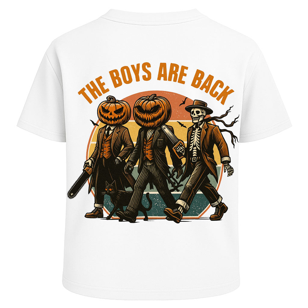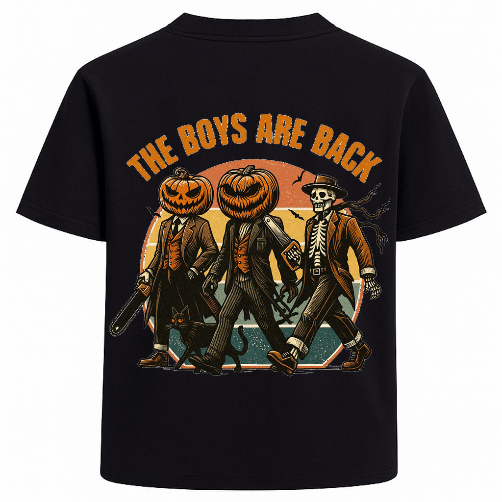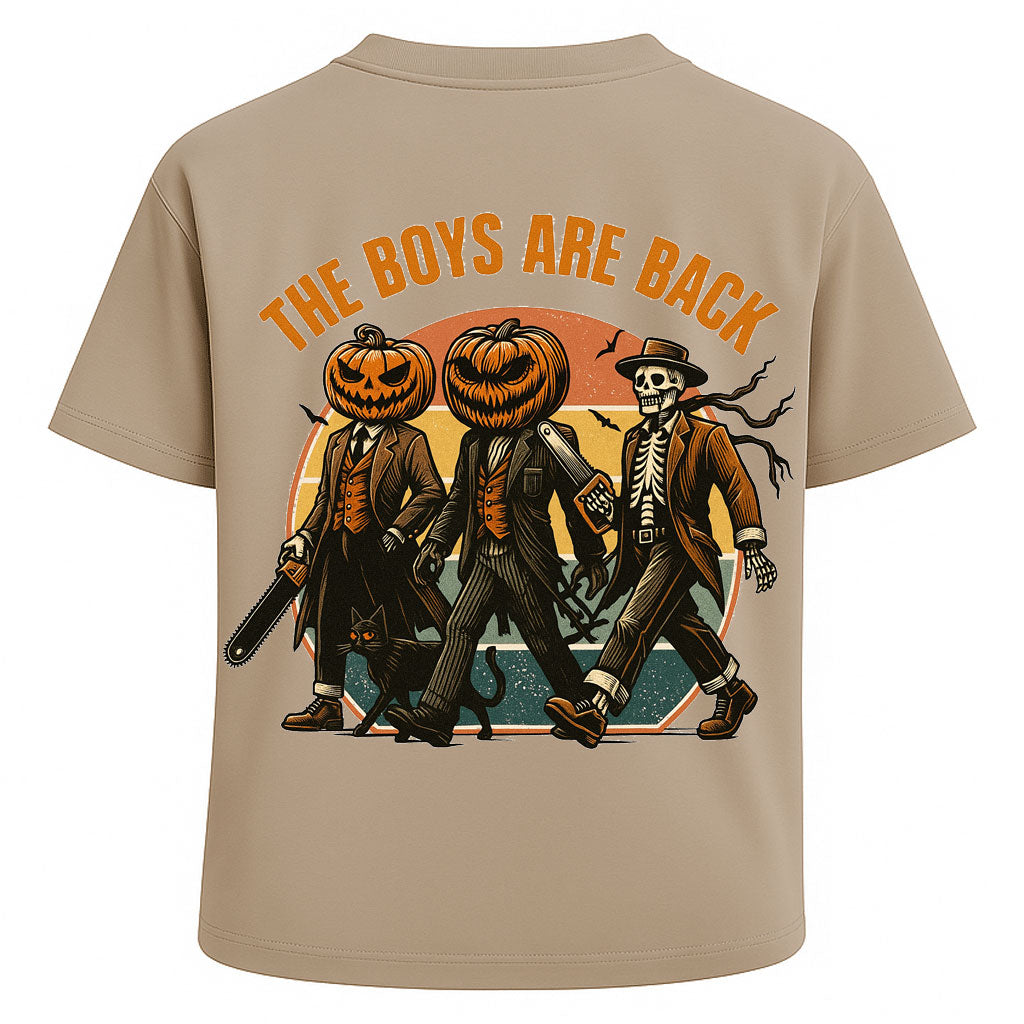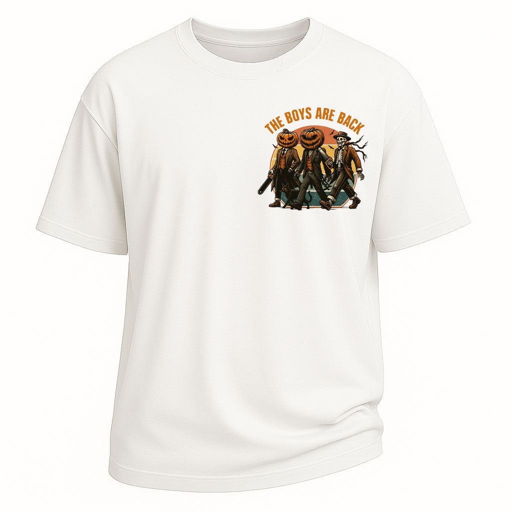 Precio regular $26.99 USDBring back the spooky crew in LouMark’s "The Boys Are Back" oversized tee. Crafted from 260G heavyweight 100% cotton, this oversized T-shirt delivers premium comfort and bold style. Featuring front and back prints of pumpkin-headed figures and a scarecrow with weapons, it’s the perfect Halloween-inspired shirt for fans of dark humor and seasonal vibes. Durable, breathable, and designed with an oversized silhouette for a relaxed fit.