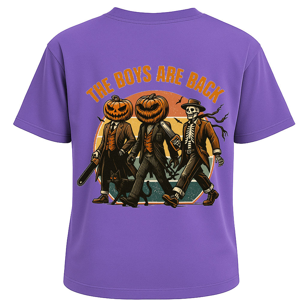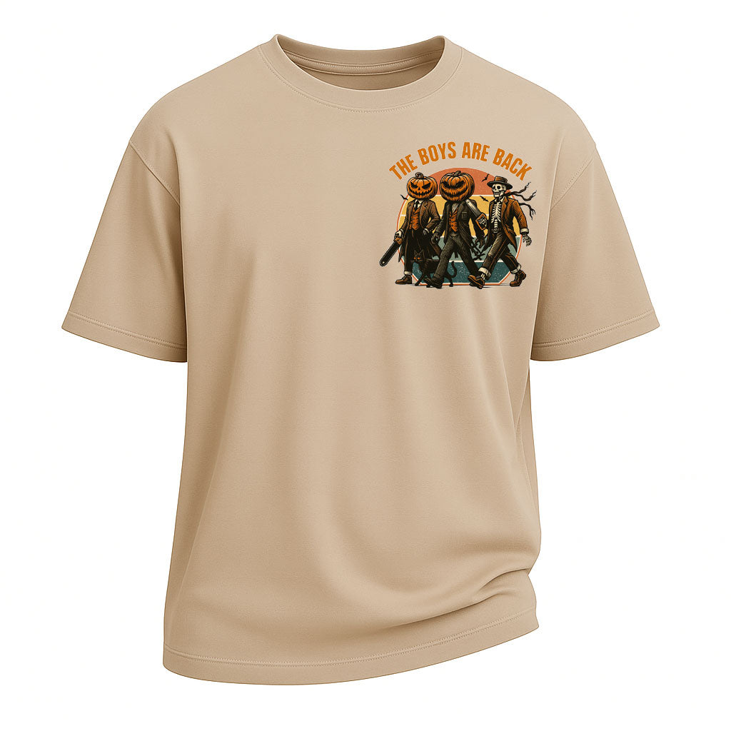 Bring back the spooky crew in LouMark’s "The Boys Are Back" oversized tee. Crafted from 260G heavyweight 100% cotton, this oversized T-shirt delivers premium comfort and bold style. Featuring front and back prints of pumpkin-headed figures and a scarecrow with weapons, it’s the perfect Halloween-inspired shirt for fans of dark humor and seasonal vibes. Durable, breathable, and designed with an oversized silhouette for a relaxed fit.