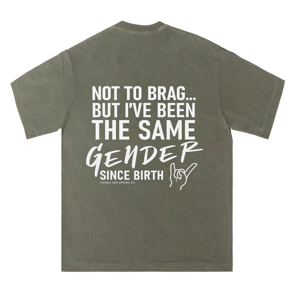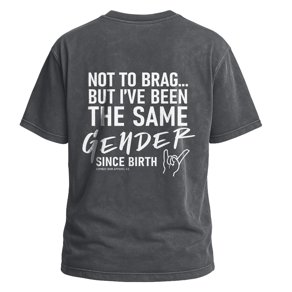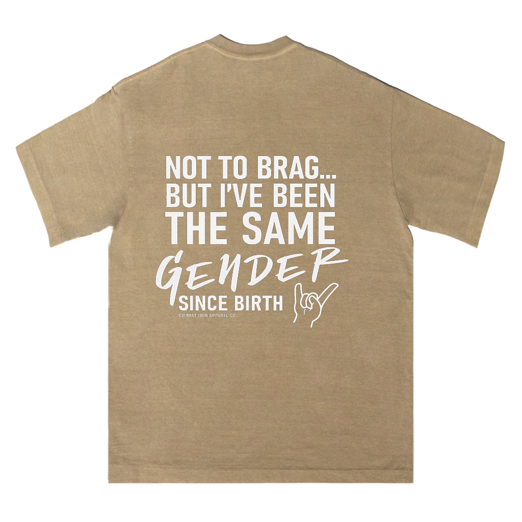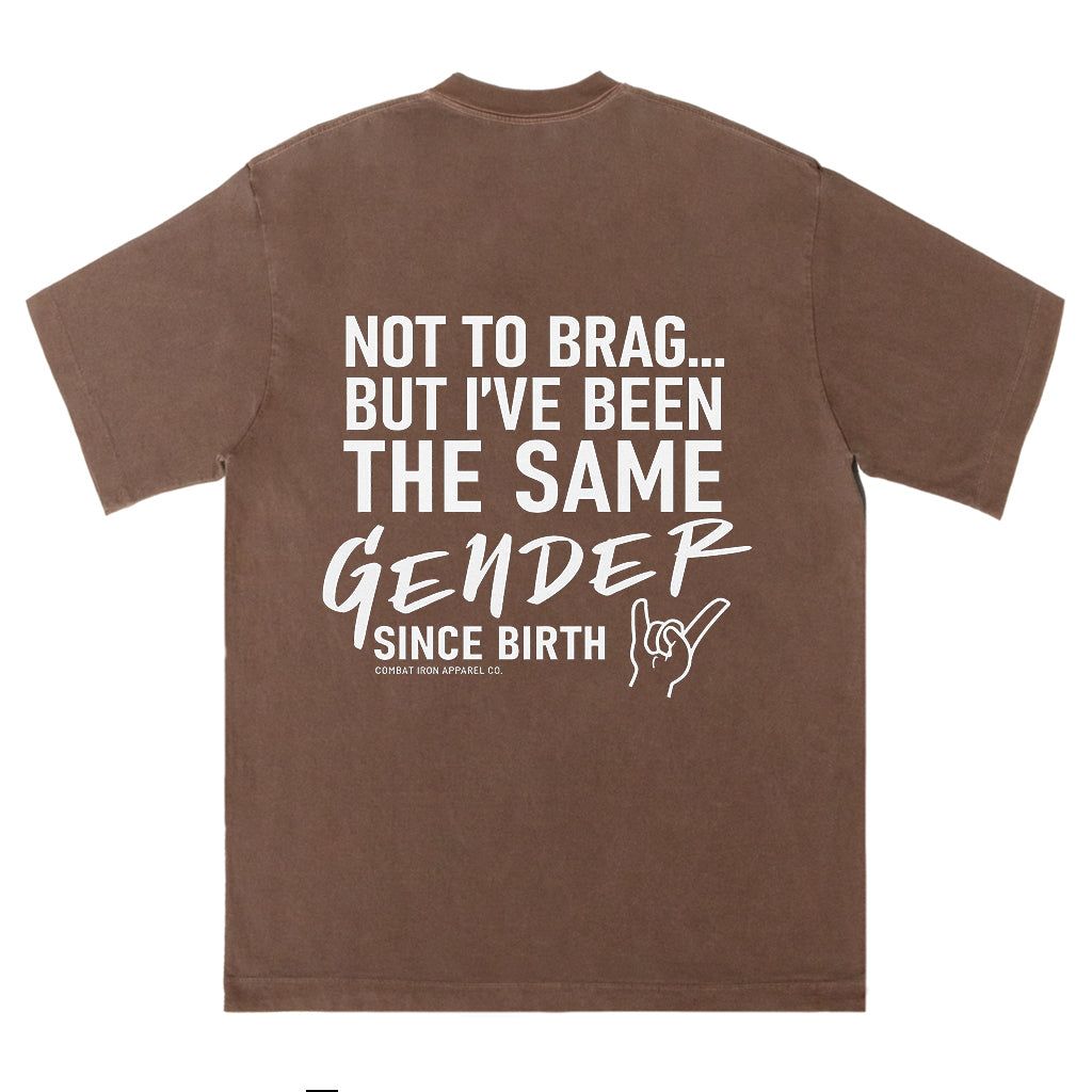 Make a clear statement with LouMark’s Been the Same Gender Tee. This washed brown shirt features bold white typography on the back reading “NOT TO BRAG... BUT I’VE BEEN THE SAME GENDER SINCE BIRTH,” with a small hand gesture graphic. Made from 100% cotton for comfortable, casual wear with unapologetic pride.
