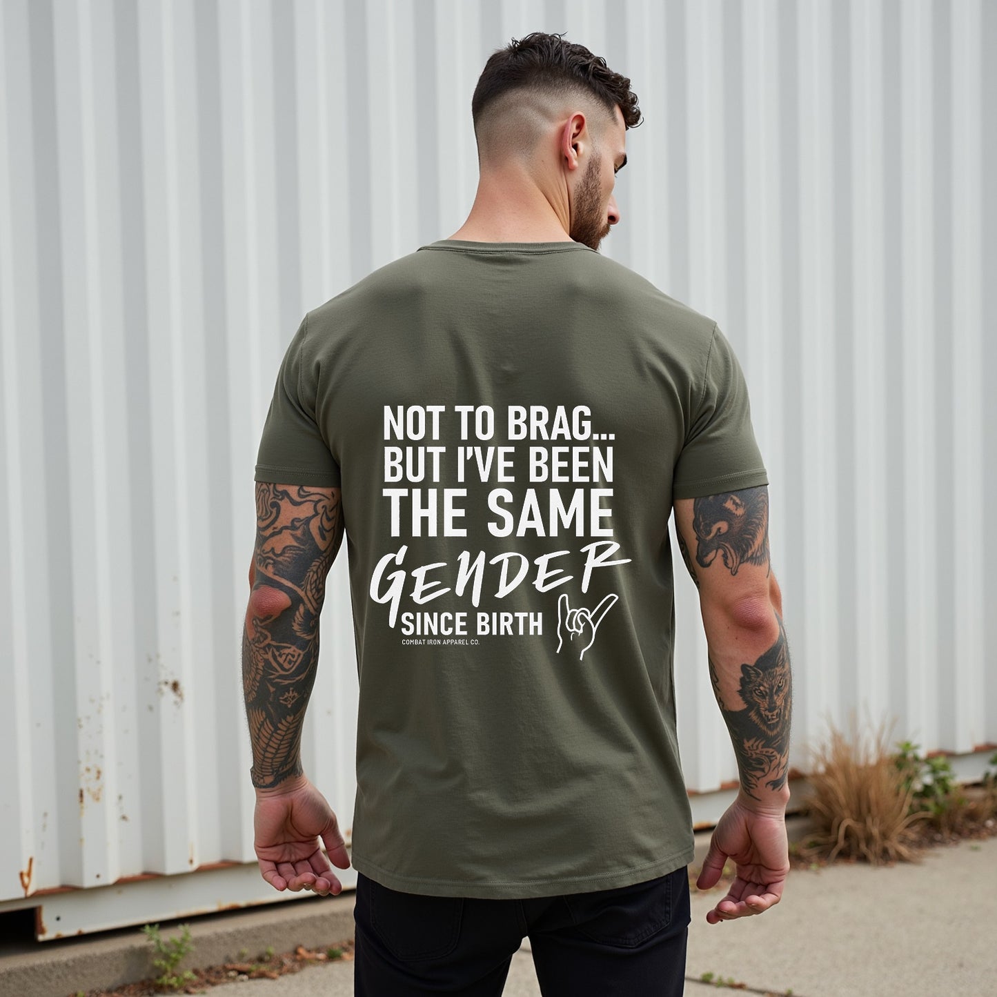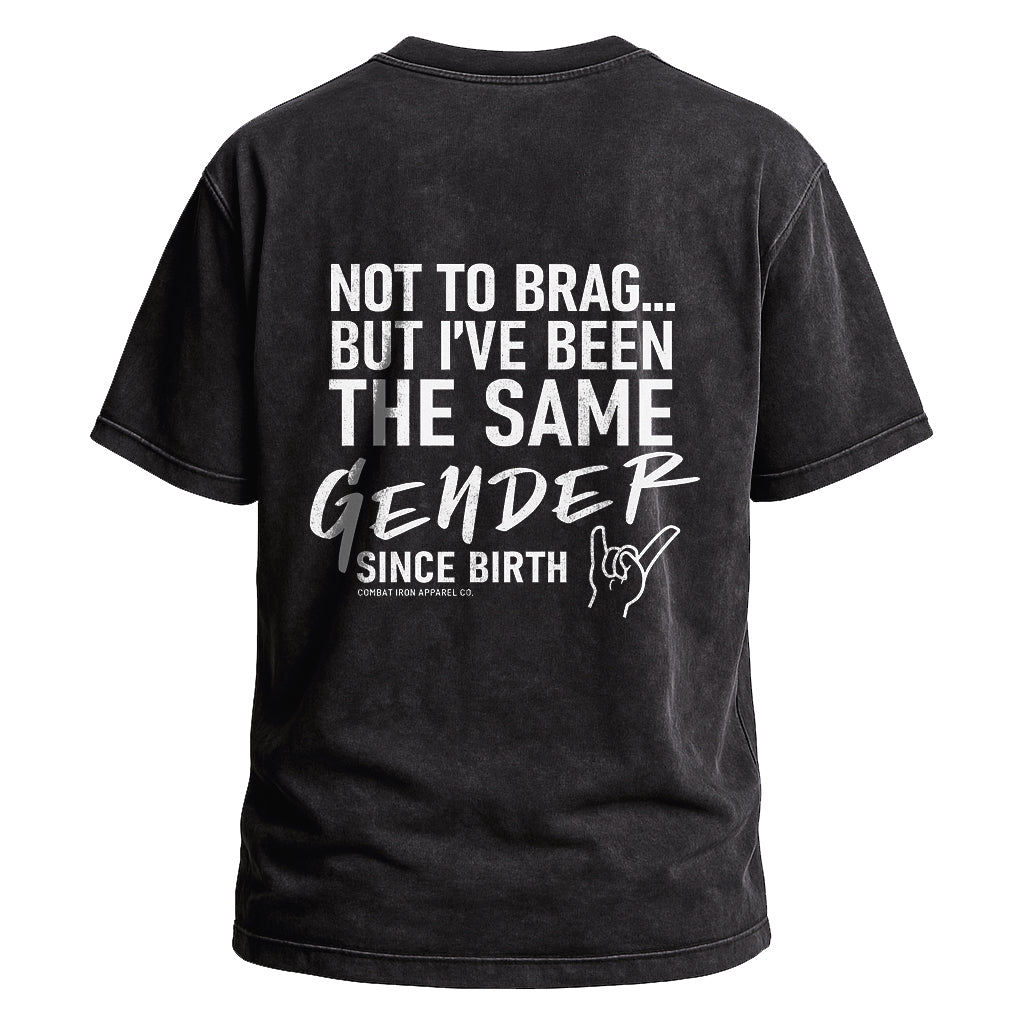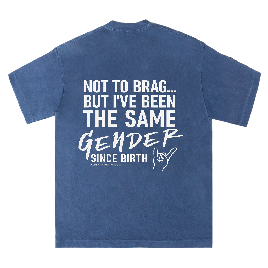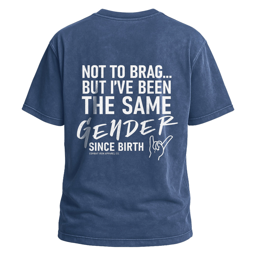 Make a clear statement with LouMark’s Been the Same Gender Tee. This washed brown shirt features bold white typography on the back reading “NOT TO BRAG... BUT I’VE BEEN THE SAME GENDER SINCE BIRTH,” with a small hand gesture graphic. Made from 100% cotton for comfortable, casual wear with unapologetic pride.