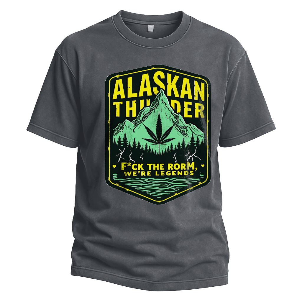 When the wild howls and the skies crack open, legends rise. This “Alaskan Thunder” tee isn’t just a shirt — it’s a declaration. With a bold weed-leaf mountain graphic and the rebellious line “F*ck the storm, we’re legends,” this design honors those who live loud, ride the high, and never blend in. Whether you're lighting one under the stars or blazing trails through life, this one’s for you.