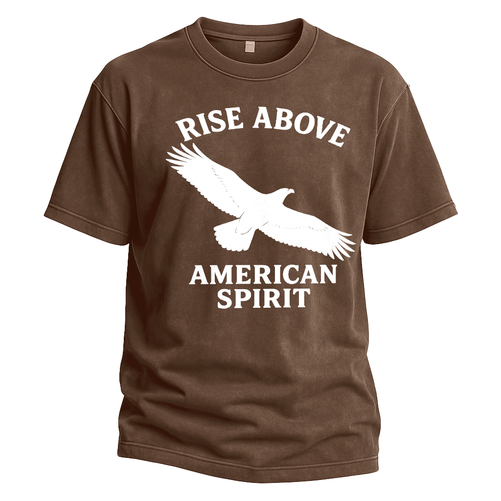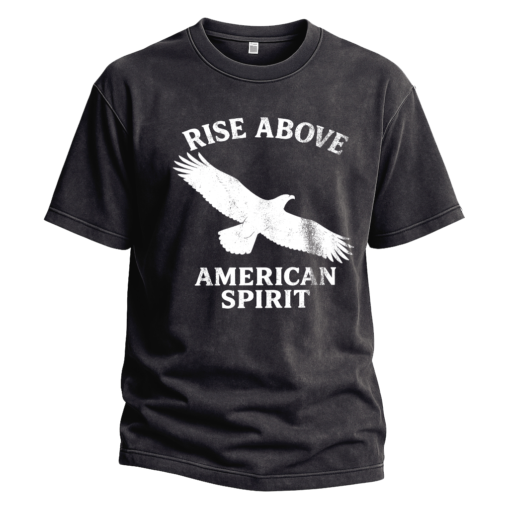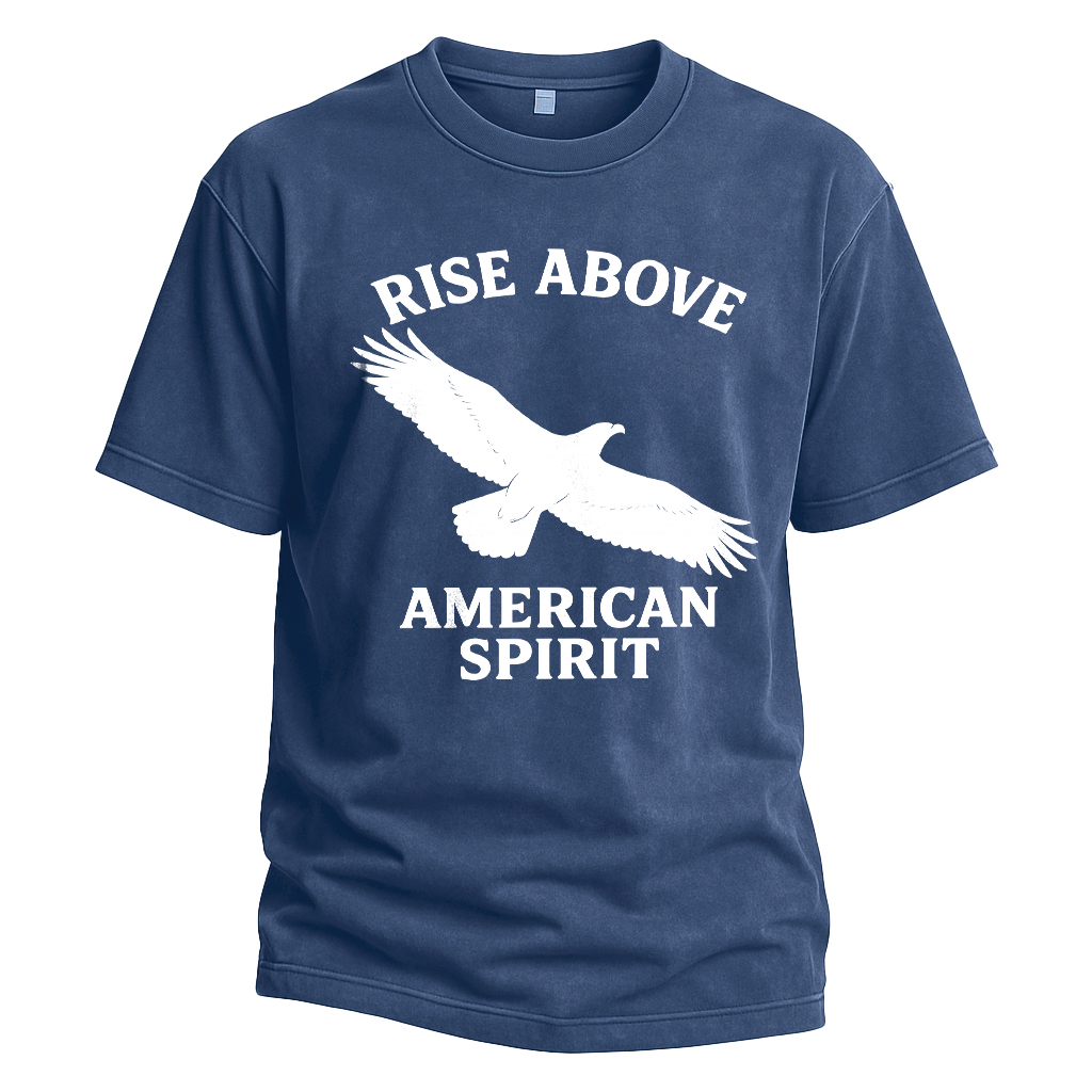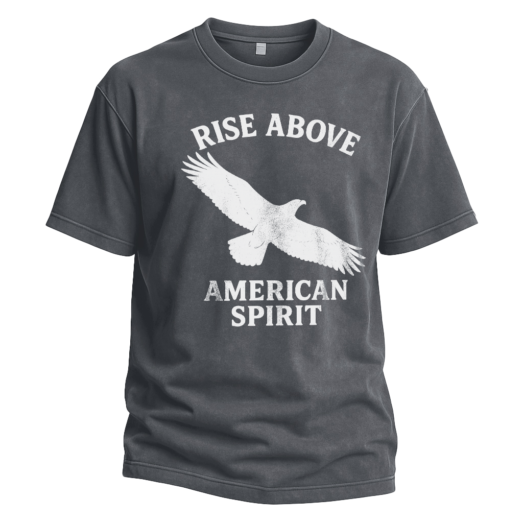 Let your spirit soar with this bold and timeless tee. Featuring a majestic eagle mid-flight and the words "Rise Above – American Spirit," this design honors freedom, resilience, and the pride of the American soul. Whether you're celebrating Independence Day or just showing your love for the land of the free, this shirt stands tall—just like you.