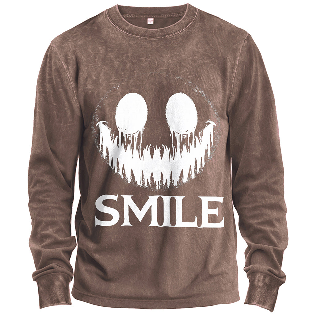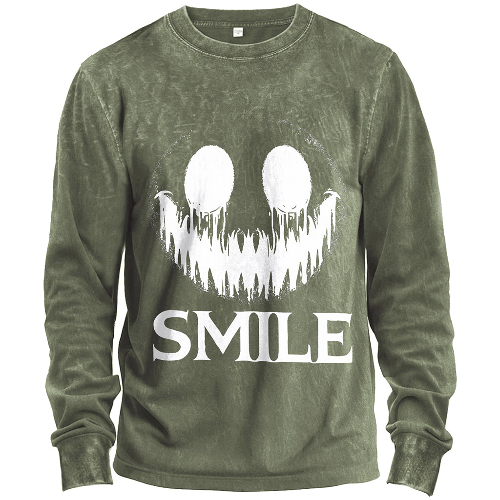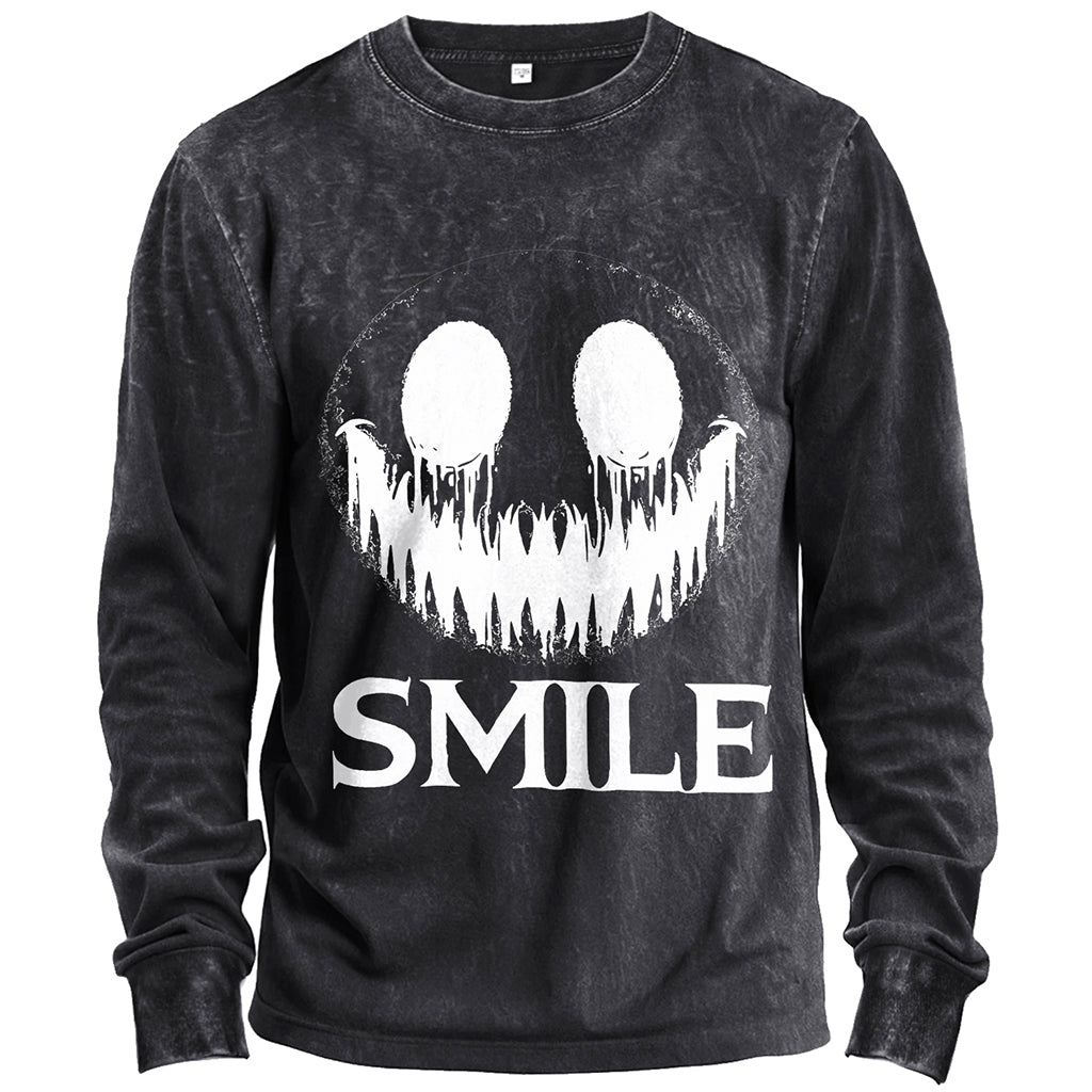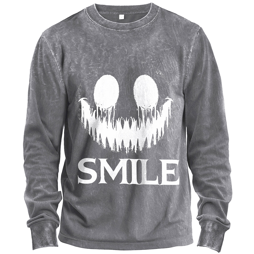 Turn eerie vibes into street style with LouMark’s Creepy Smile Halloween long-sleeve t-shirt. Made from 230G 100% cotton, this heavy-weight tee provides comfort and durability for everyday wear. The standard fit cut makes it versatile for layering or wearing solo. The bold front graphic features a sinister white smiley face with jagged teeth above the word “Smile,” creating a chilling yet stylish Halloween-inspired look. Ribbed cuffs and a crew neckline complete the silhouette.