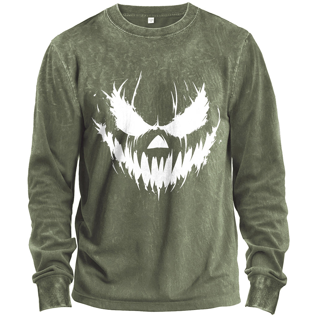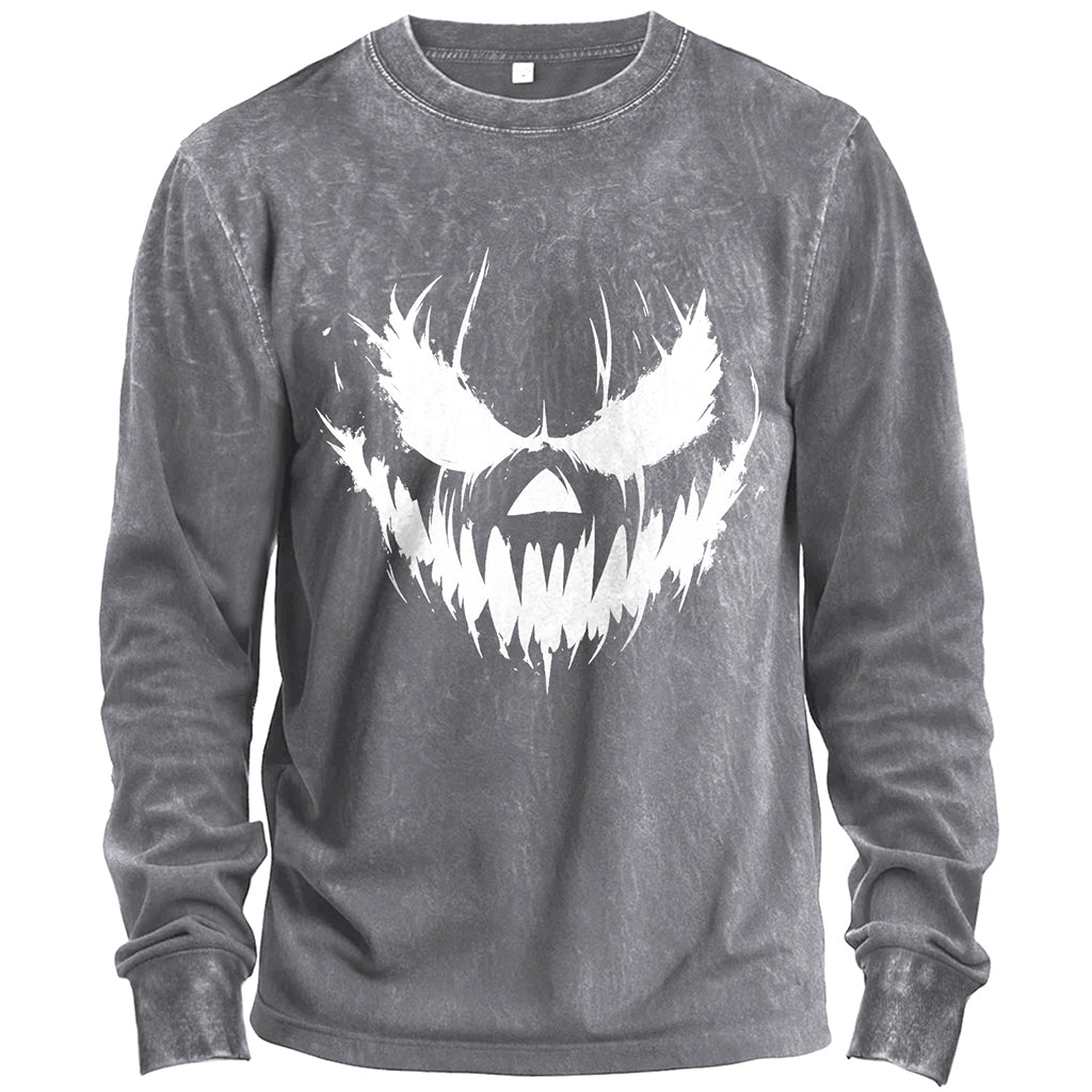 Embrace the dark side with LouMark’s Evil Grin Halloween long-sleeve t-shirt. Made from 230G 100% cotton, this heavy-weight tee ensures durability with all-day comfort. The standard fit design makes it versatile for layering or wearing solo. The bold front graphic features a sinister white grin with sharp jagged edges, creating a spooky Halloween-ready look with streetwear attitude. Ribbed cuffs and a crew neckline lock in the classic silhouette.