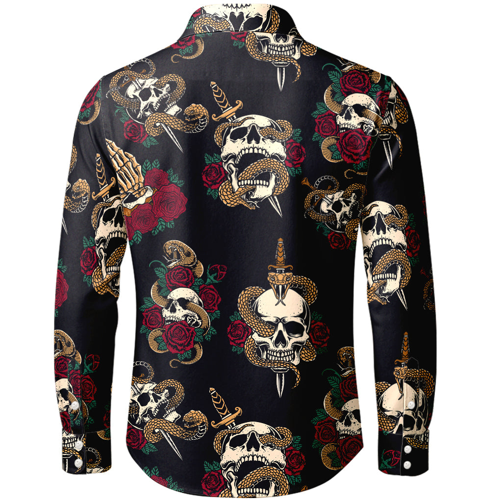 Ink-inspired and unapologetic. This long-sleeve button-up features an allover tattoo-flash print—grinning skulls wrapped in serpents, daggers, and red roses—set on deep black for maximum contrast. The smooth 100% polyester fabric is lightweight, wrinkle-resistant, and quick-drying, ready for concerts, festivals, or bold everyday fits.