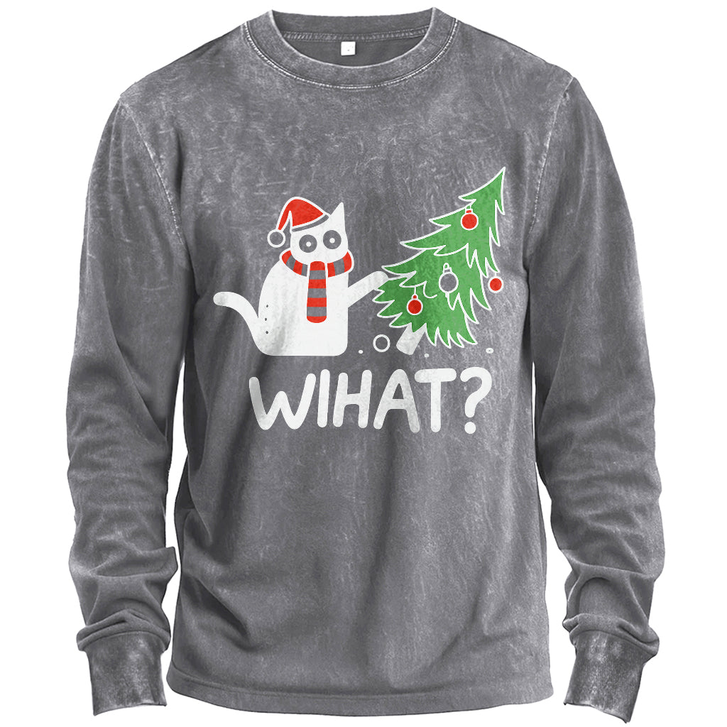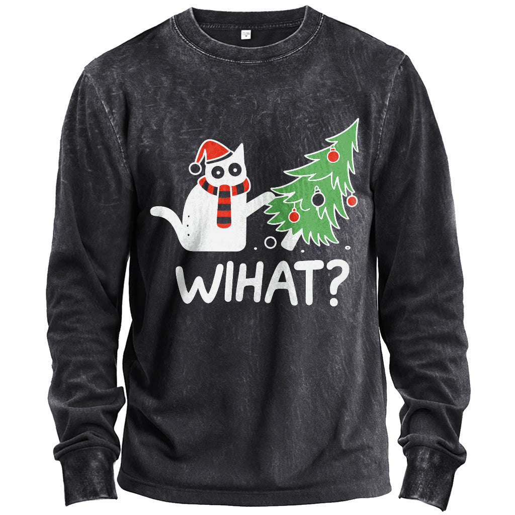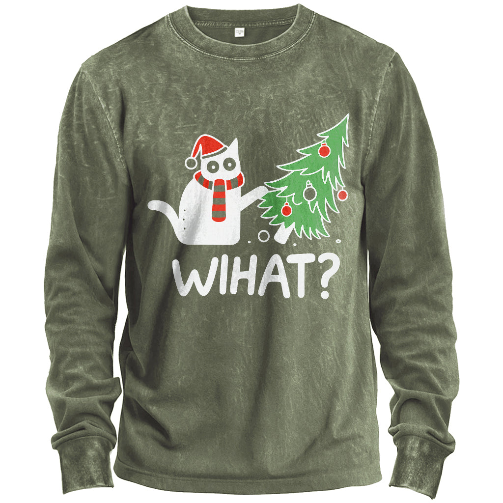Playful and cozy for the holidays. This men’s long-sleeve T-shirt pairs a vintage-wash army-green body with a mischievous cat tipping a Christmas tree and the cheeky “WIHAT?” text—perfect for gifting or self-wear.