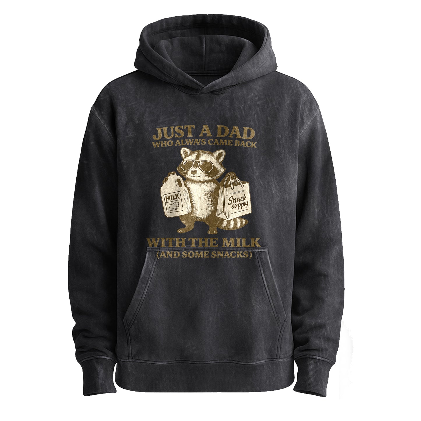 For the dads who always return with the milk…and a snack haul. This vintage-washed olive hoodie features a cool raccoon graphic and the line “Just a Dad who always came back with the milk (and some snacks).” Cut from hefty 350g 100% cotton for a soft, broken-in feel and serious warmth.