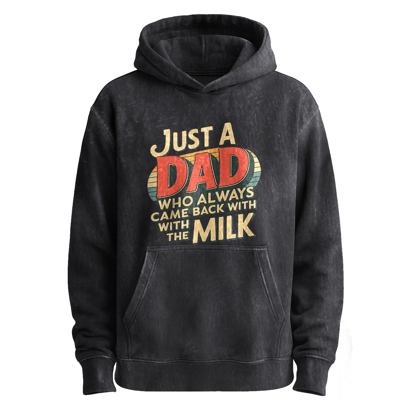 Celebrate the dependable dads. This vintage-washed army-green hoodie features a bold retro “Just a DAD who always came back with the MILK” graphic. Cut from beefy 350g 100% cotton for a soft, broken-in feel.